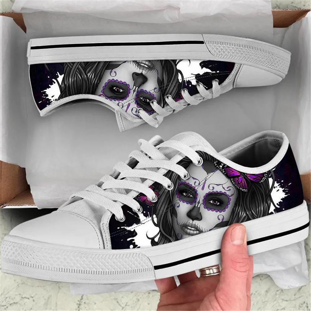 ELVISWORDSМодная Вулканизированная обувь для девочек-подростков; Принт с черепами; Женские спортивные кроссовки для бега; Дизайнерская обувь на плоской подошве с фиолетовыми бабочками