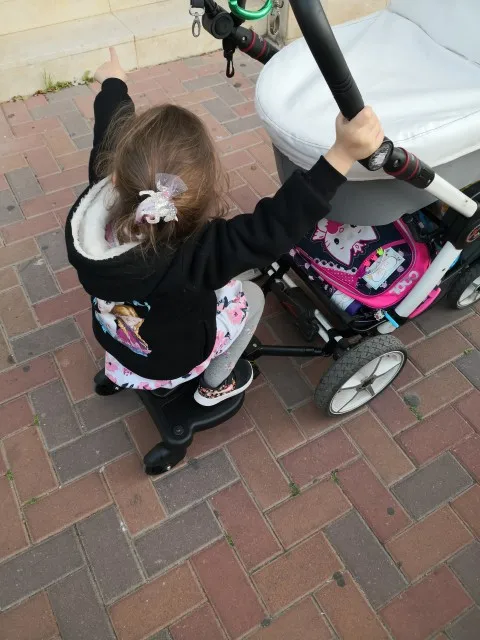 Соответствует описанию, крепление это лента с липкой основой подойдёт обсалютно на любую коляску сейчас у нас зима по сугробу не большому едит хорошо и вообще устраивает, единственное думала сидушка будет повыше немного не удобно на неё забираться приходится помогать ребёнку, полностью сделанна из прочного пластика, дороговато, но дешевле чем в России аналоги