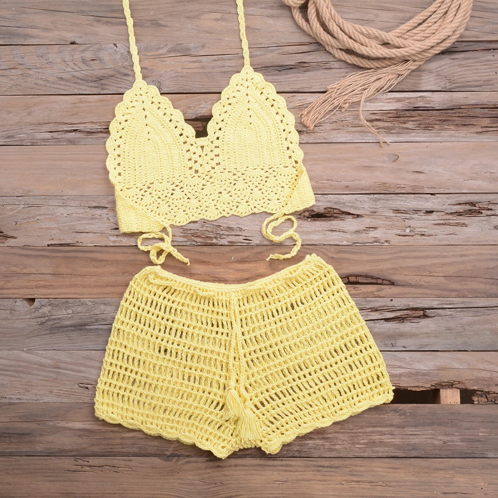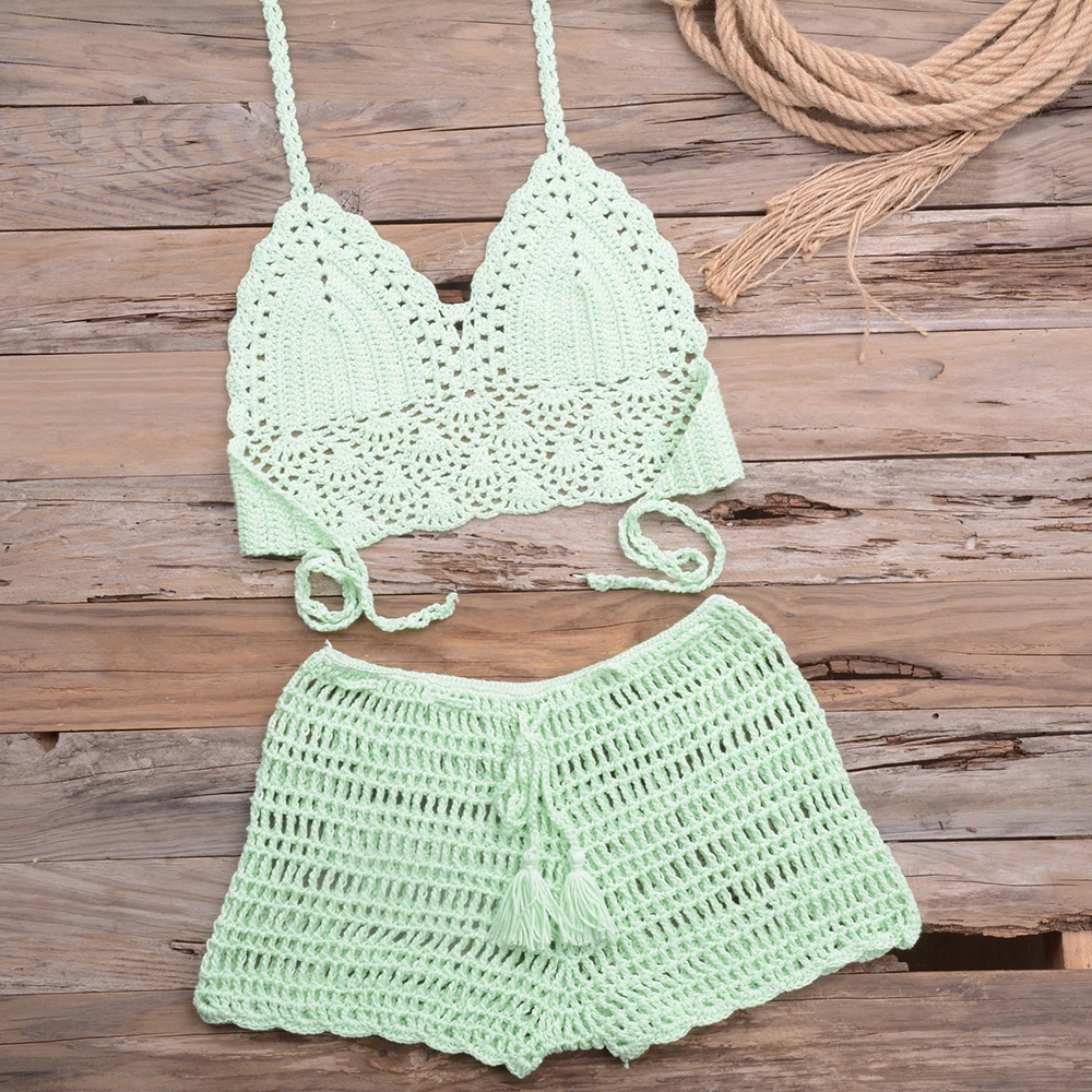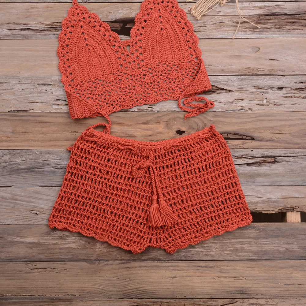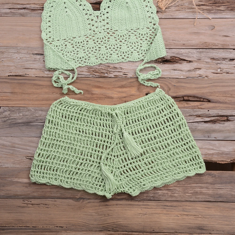 Вязаный комплект бикини с кисточками, Раздельный купальник с эффектом пуш-ап, бандажный купальник, пляжный купальник, бикини