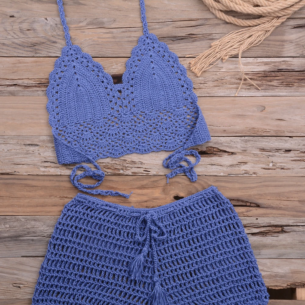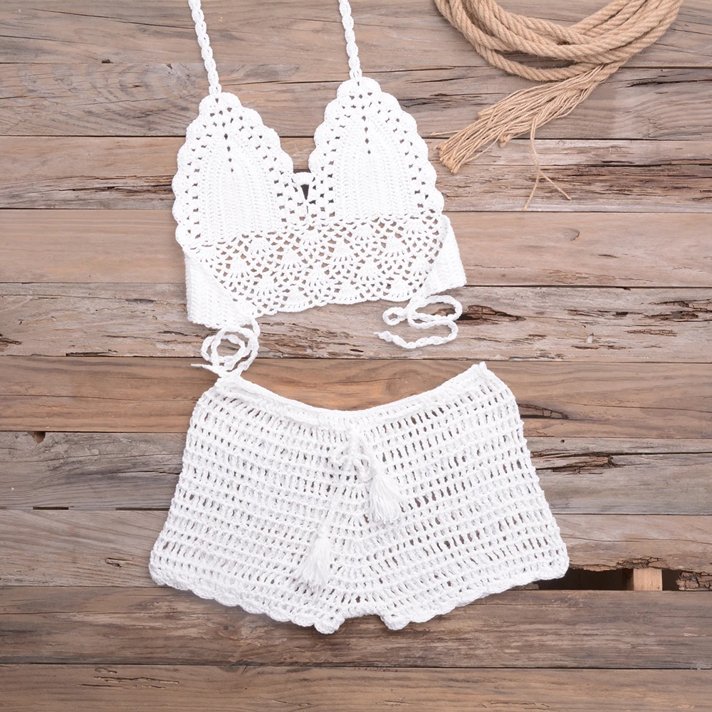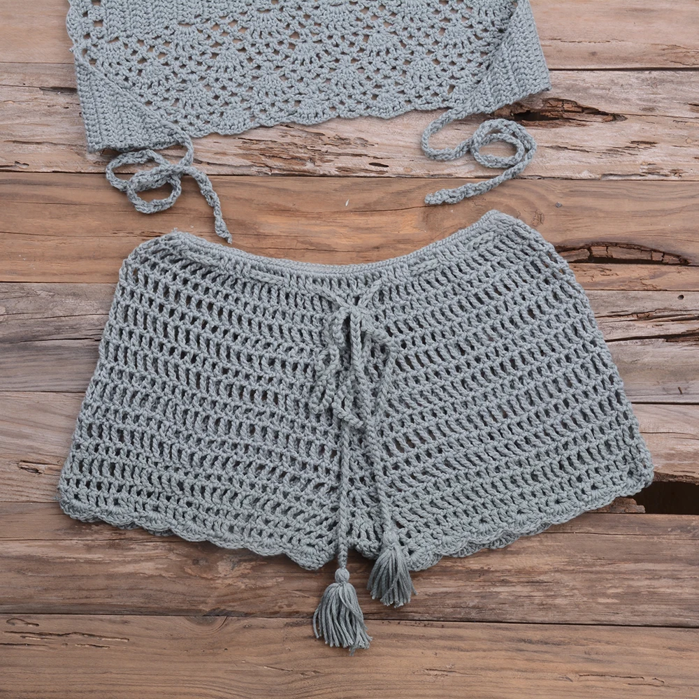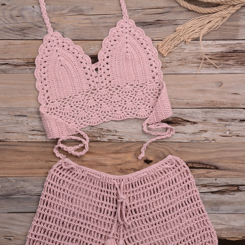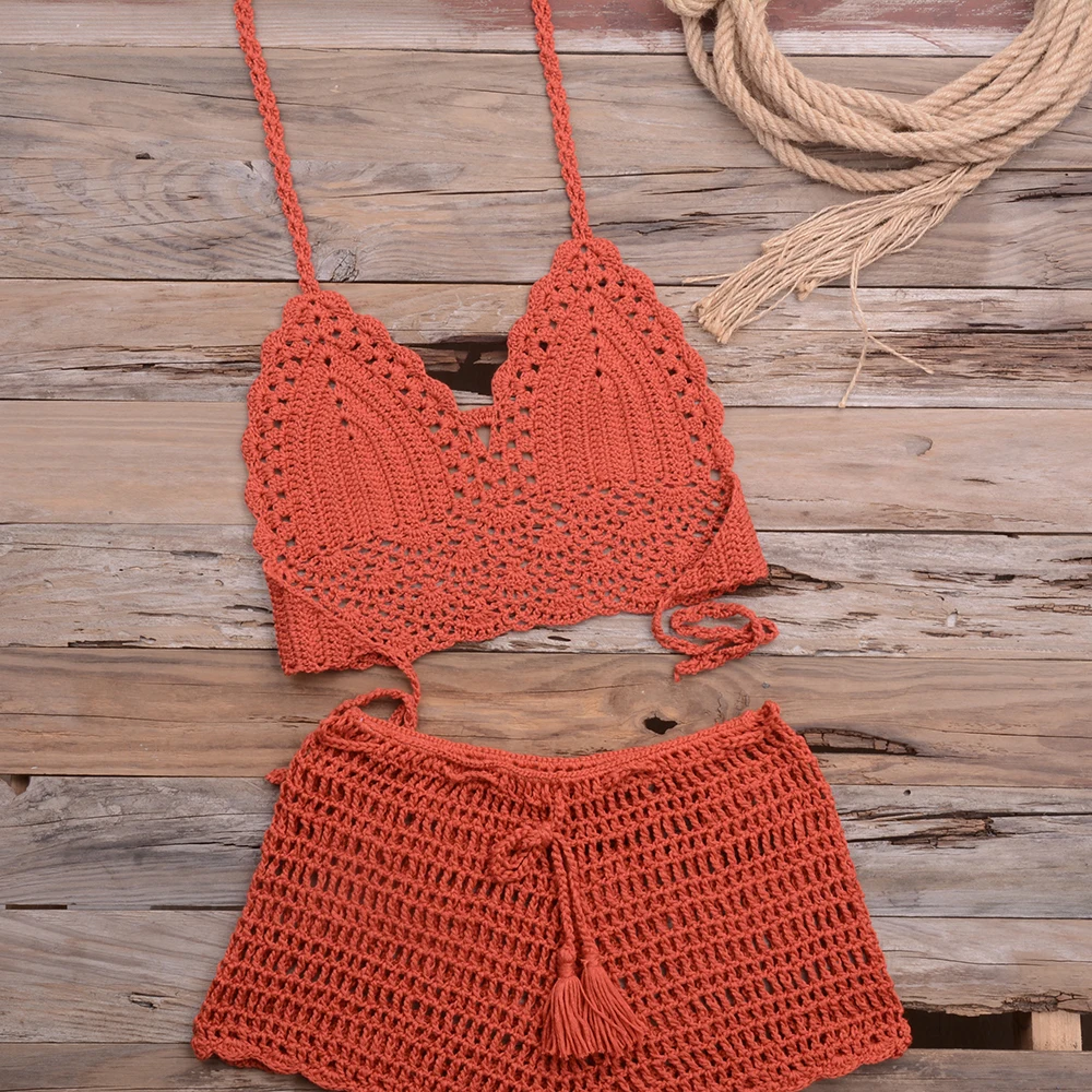 Вязаный комплект бикини с кисточками, Раздельный купальник с эффектом пуш-ап, бандажный купальник, пляжный купальник, бикини