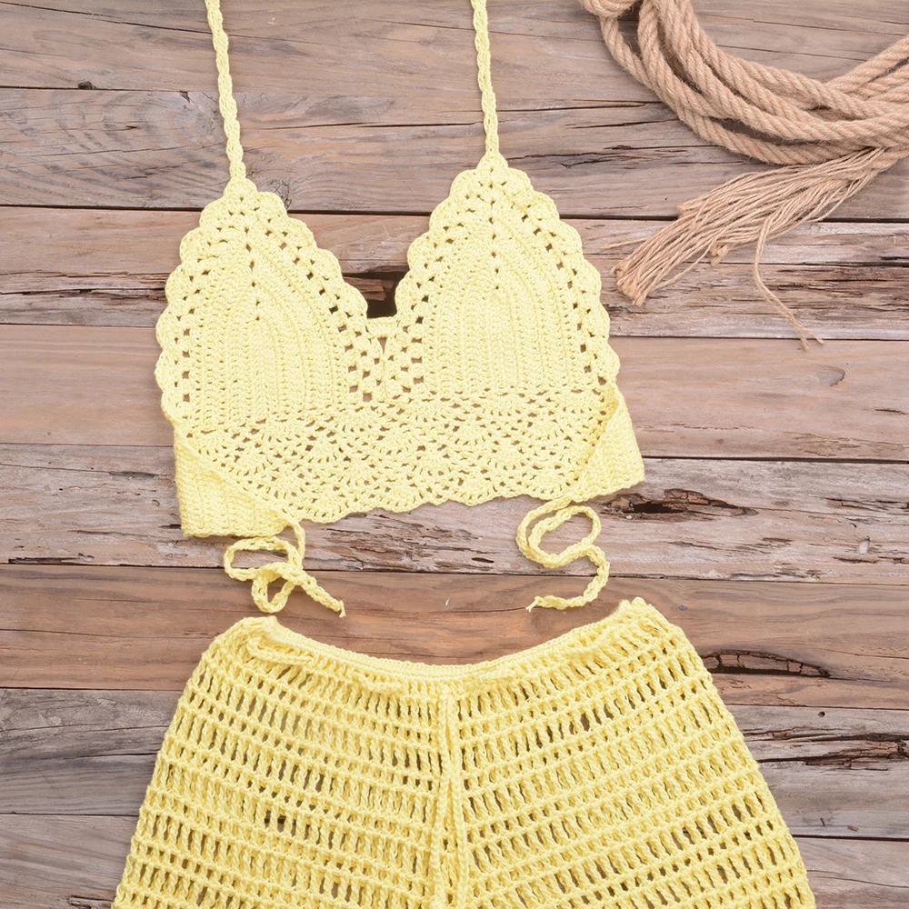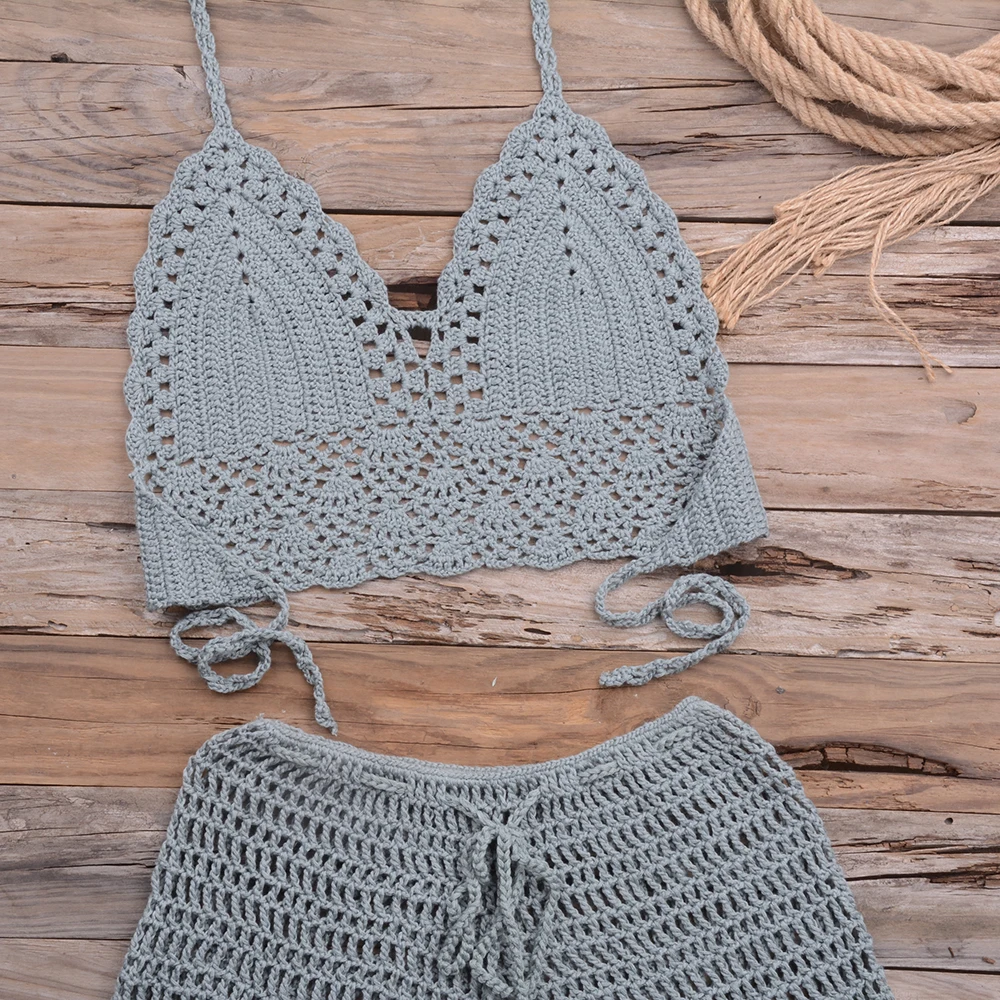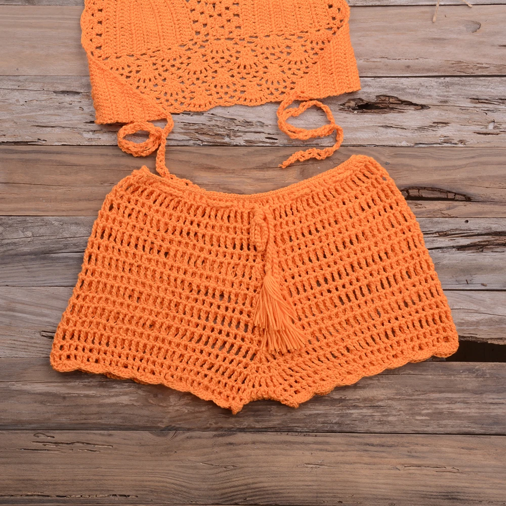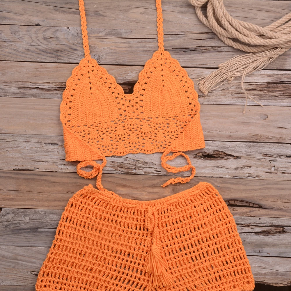 Вязаный комплект бикини с кисточками, Раздельный купальник с эффектом пуш-ап, бандажный купальник, пляжный купальник, бикини