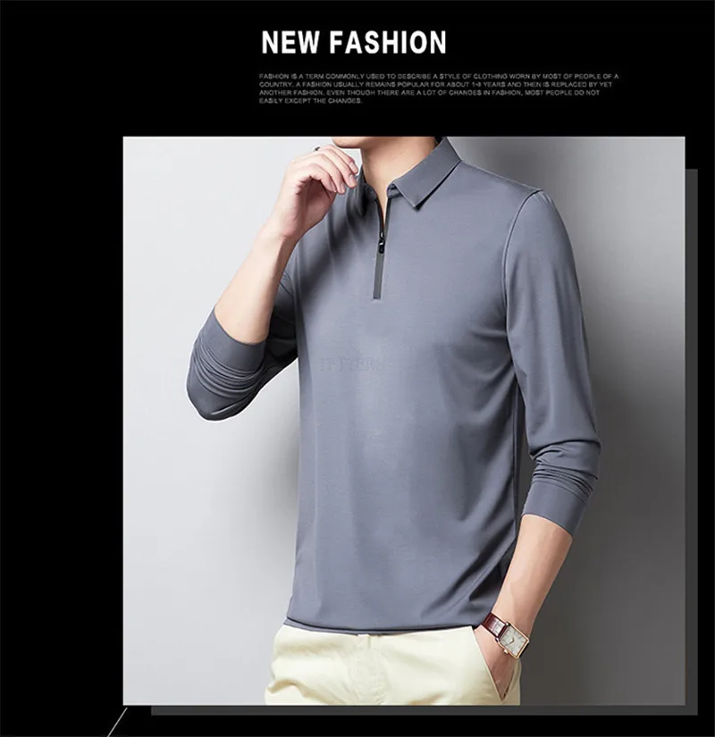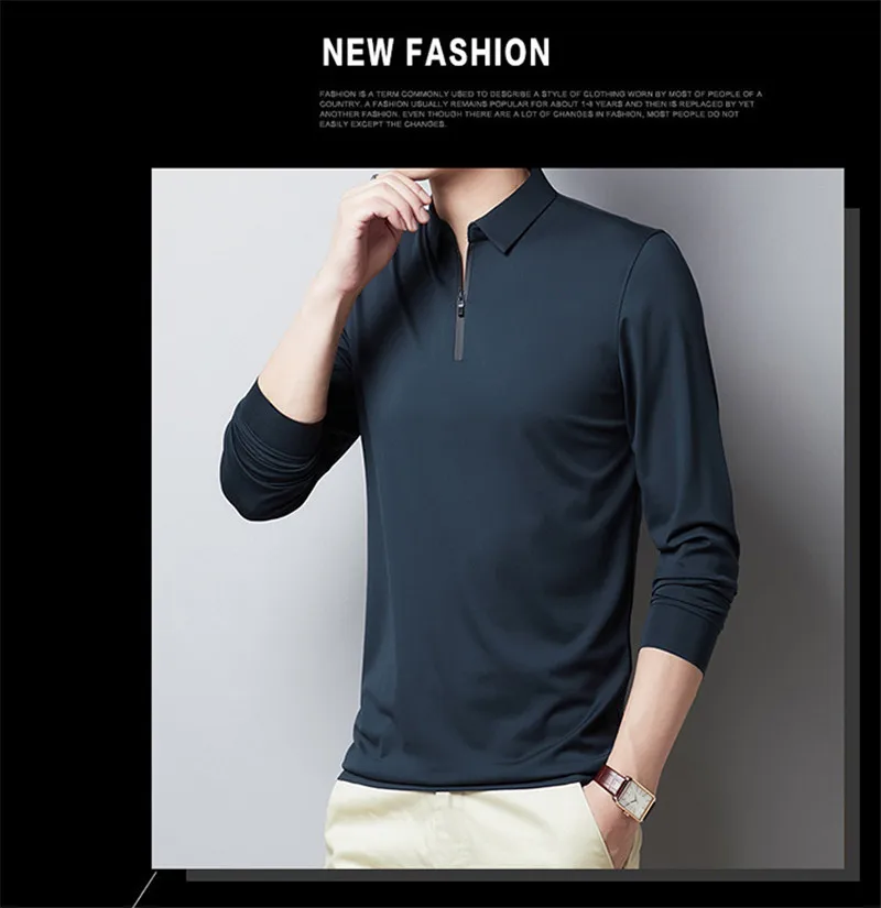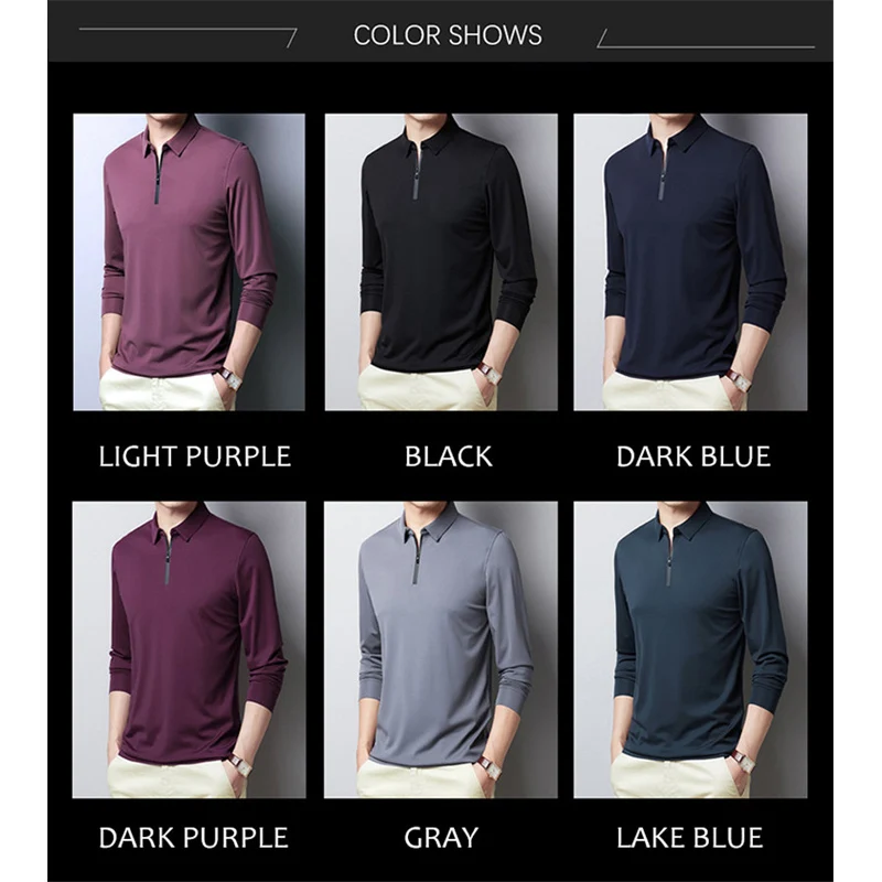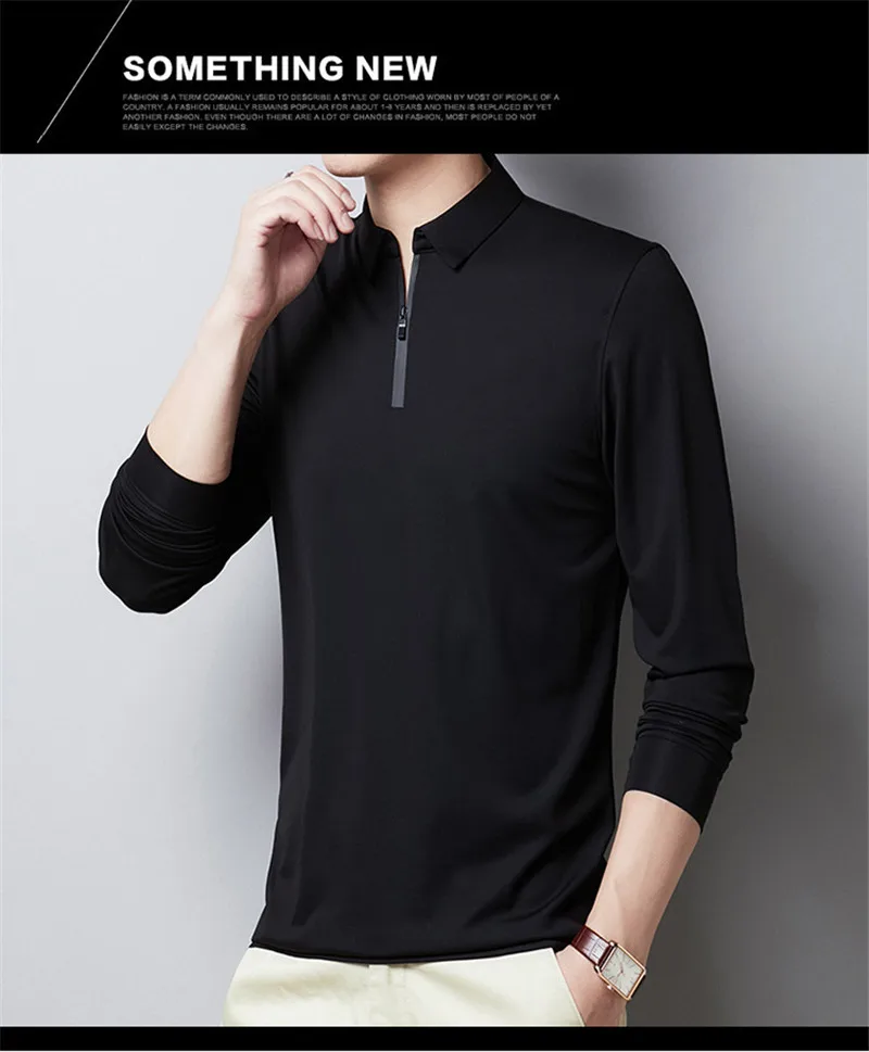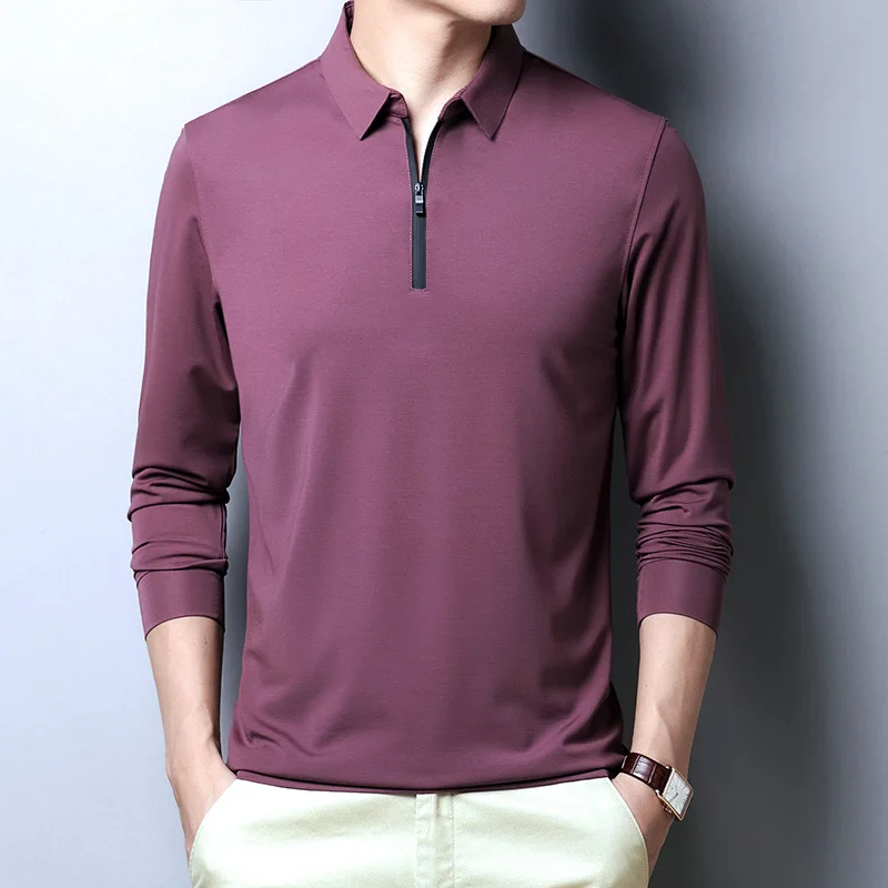 Мужская футболка с длинным рукавом BROWON, осенняя деловая модная Однотонная футболка с отложным воротником, на молнии, с украшением