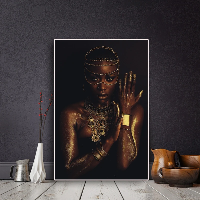 Черно-Золотая Африканская женщина с ожерельем холст картины плакаты...