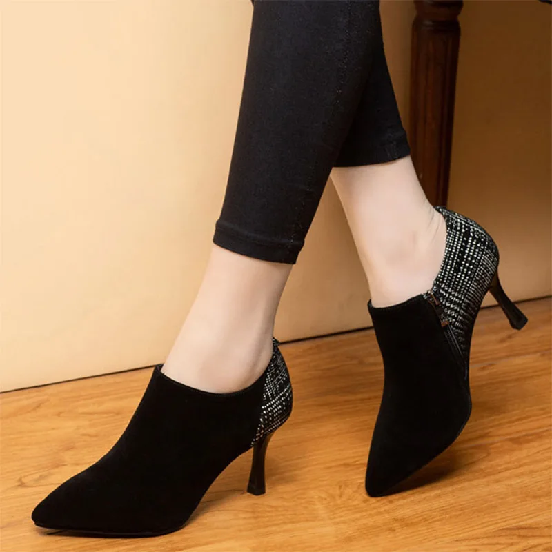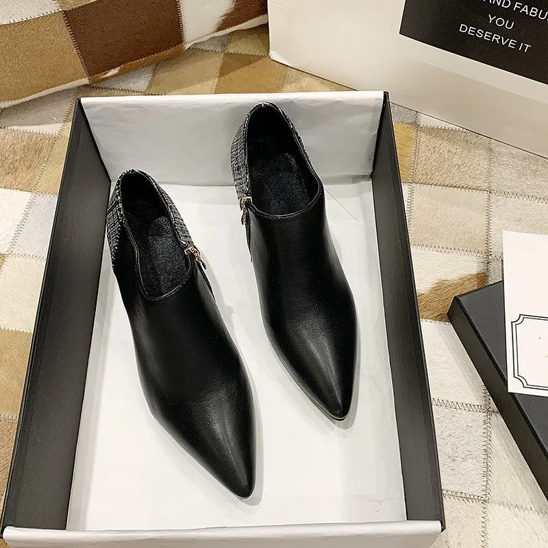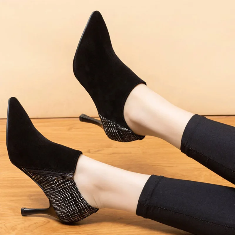 Женские ботинки с открытым носком, Черные ботильоны из флока на высоком каблуке, Лоскутные ботинки, классические ботинки с острым носком, обувь на тонком каблуке, 2020 г, зима 8537