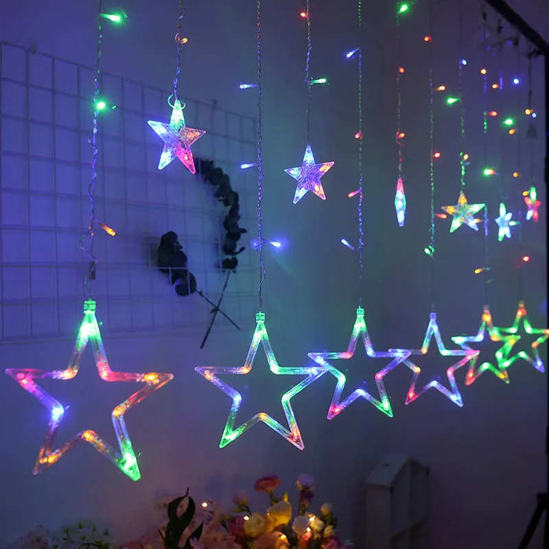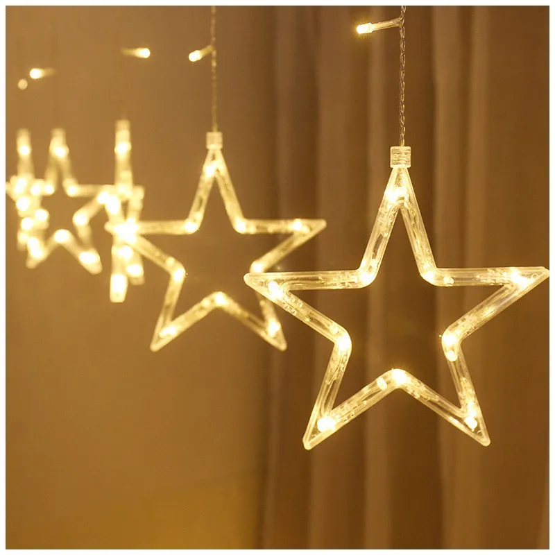 2. Простота в использовании: 12 звезд (2 размера), всего 138 шт. светодиодных занавесок, 29 в низкого напряжения питания, непосредственно подключите и отключите для включения и выключения питания.