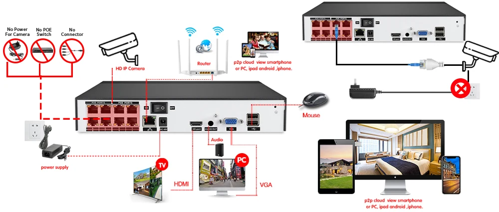 Нет дополнительных кабелей питания или адаптеров, просто подключив ip-камеру к NVR с помощью одного кабеля, вы можете легко завершить установку без знания о компьютере или сети и начать наслаждаться супер простым мониторингом среди вашего смартфона, планшета или ПК.Экономьте деньги и удобный POE NVR = NVR + POE коммутатор, подключи и работай и простая настройка!