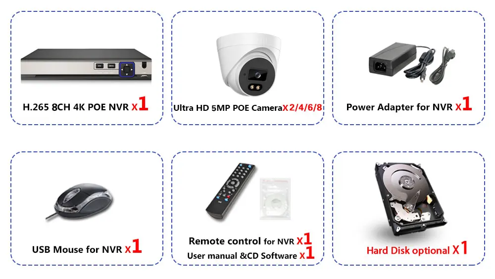1 сетевой видеорегистратор 8CH 4K POE NVR;2/4/6/8 X HD POE IP 5.0MP для дома и улицы ИК ночного видения камеры;1 X Блок питания для NVR;1 х USB мышь для NVR;1 компакт-диск программного обеспечения для NVR;1 пульт дистанционного управления для NVR;Жесткий диск опционально!