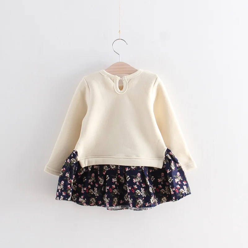 Детское платье для девочек, новое осенне-зимнее платье с длинным рукавом и принтом для маленьких девочек, свитер с милым кроликом и цветочным бантом и бархатное комбинированное платье
