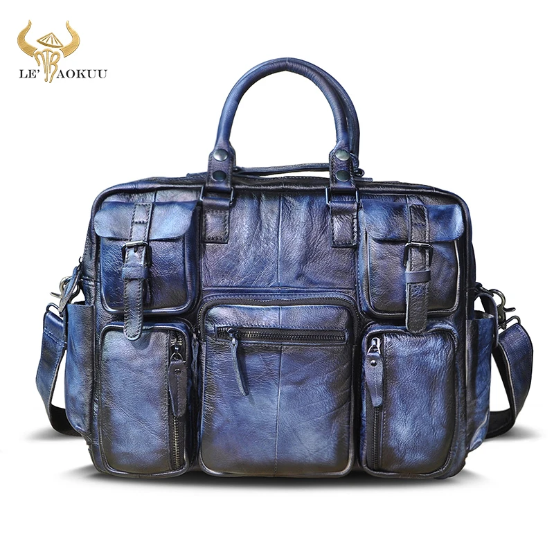 Для мужчин из натуральной кожи Винтаж с большим голубым Ёмкость путешествия Портфели Бизнес 15,6 "для ноутбука атташе сумка портфель 3061