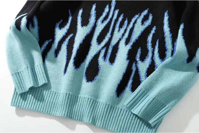 Корейский Свободный вязаный пуловер с принтом пламени для мужчин и женщин, уличная одежда в стиле хип-хоп, пуловер с круглым вырезом, свитер