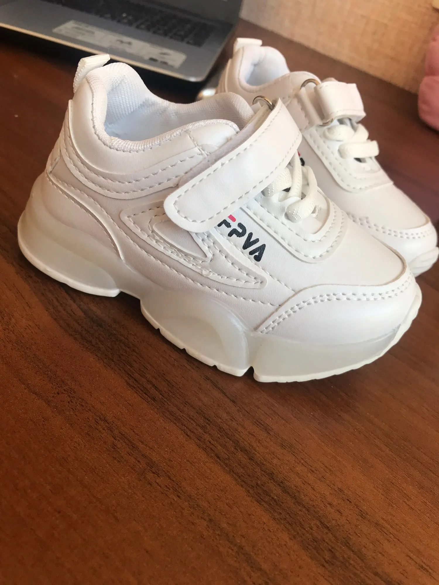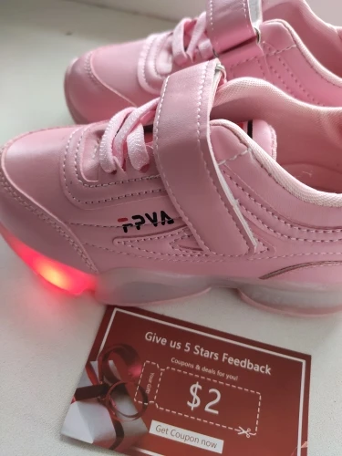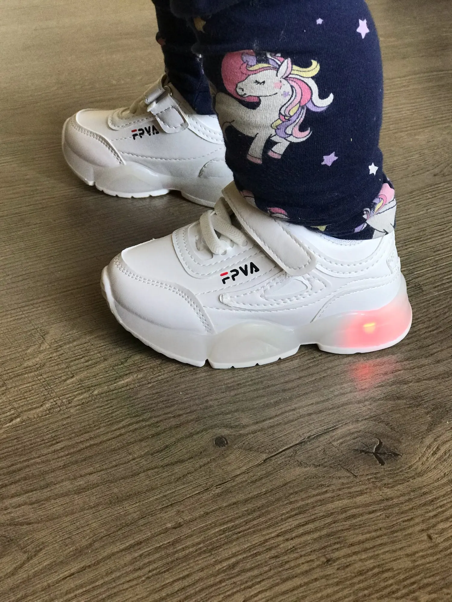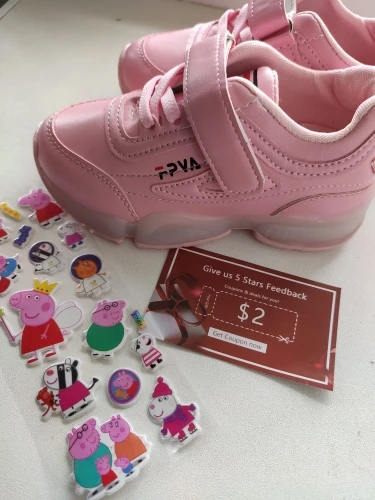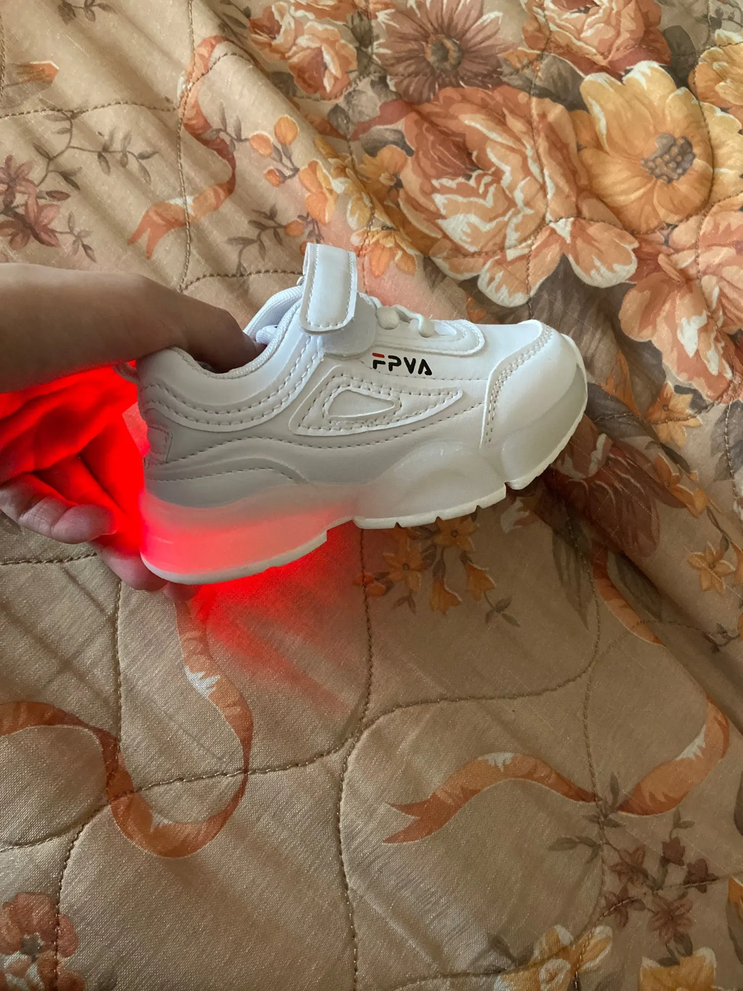 Кроссовки пришли достаточно быстро,не помятые,даже положили подарок наклейки со свинкой пеппой,ребенок был очень рад,спасибо!!Что касается самих кроссовок,то они имеют стильный крой и дизайн,но присутствует брак в виде неаккуратно запаенной или склееной ленты,я зашила и спрятала в дырочку для шнурков,так что не критично,сверкают,работают,под пяткой спятан механизм включения подсветки подошвы,насколько он долго не могу сказать. Длина стопы 15 см в 2 года,взяла побольше размер 26,все подошло и даже чуть на вырост. Спасибо,я довольна.