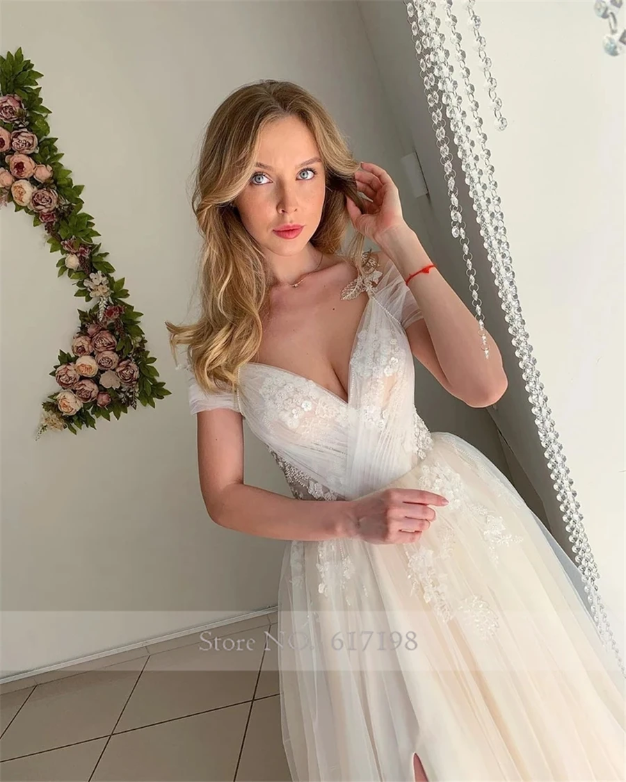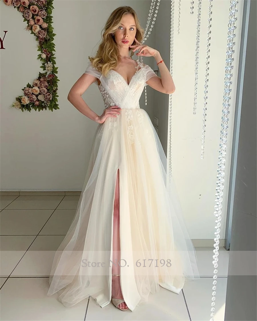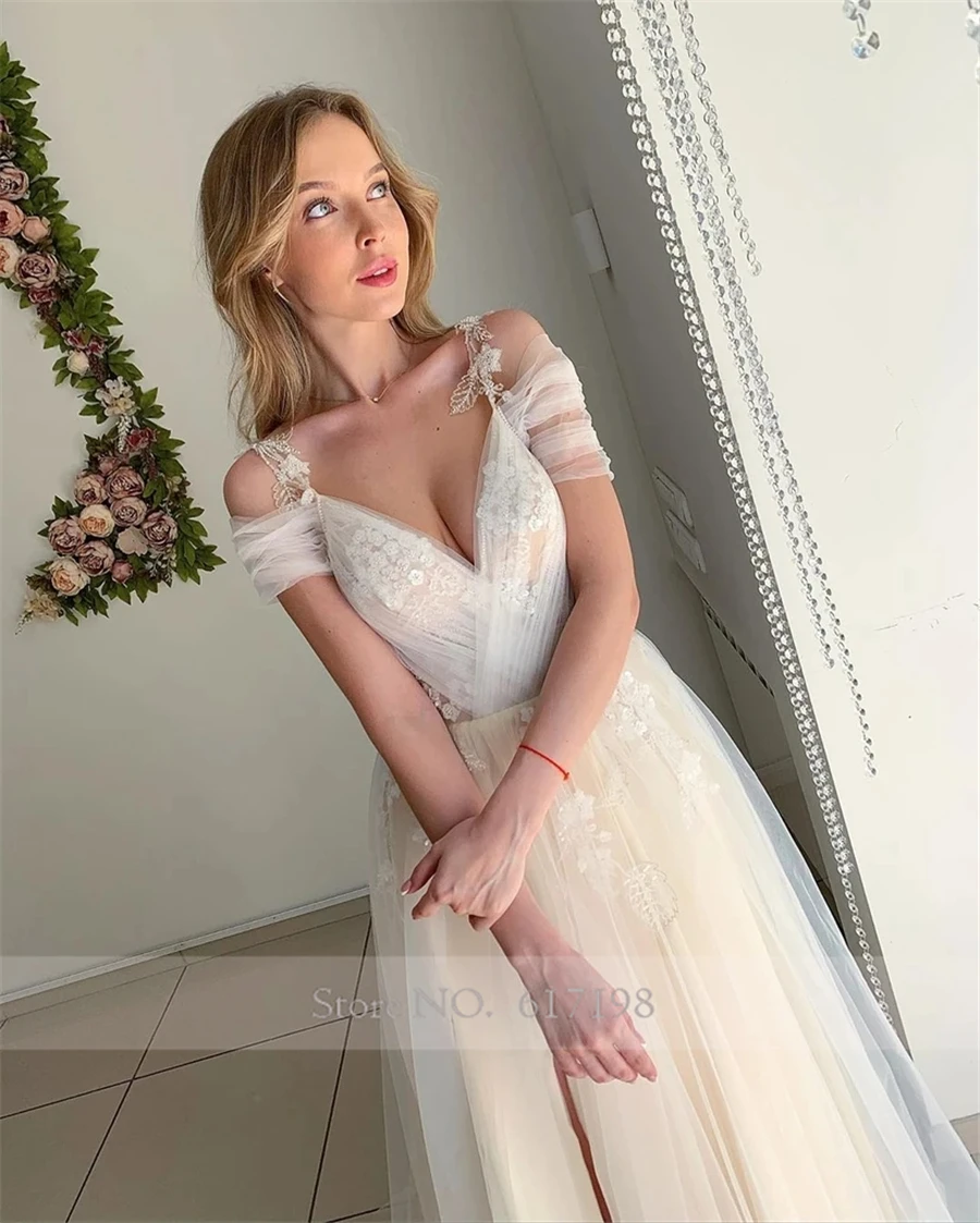 Платье Свадебное ТРАПЕЦИЕВИДНОЕ с открытыми плечами, тюль с рюшами и кружевной аппликацией, на бретелях-спагетти, цвет Шампань