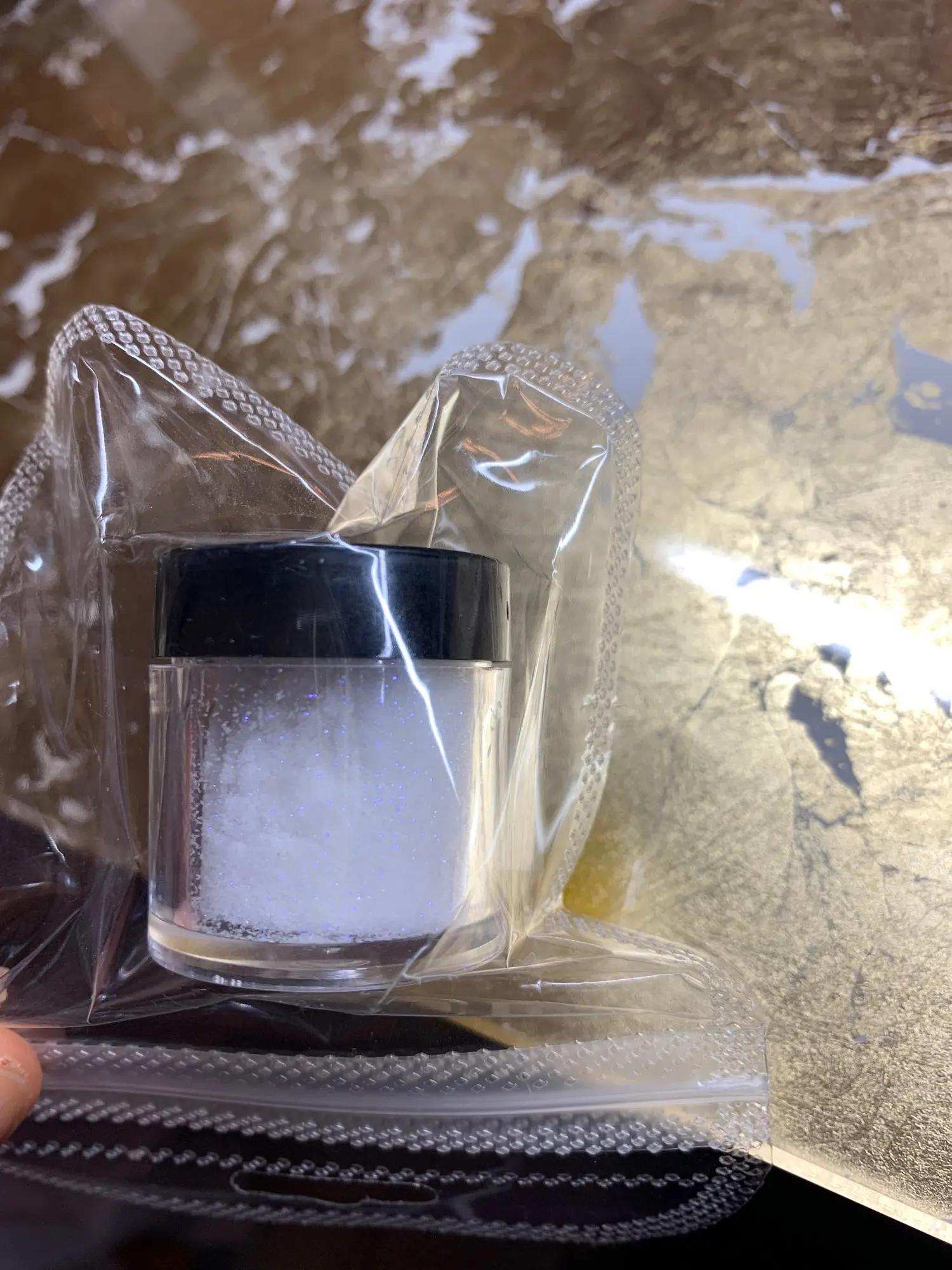 Заказ кинули в почтовый ящик. Доставка почти два месяца. Баночка полная, на вид как песок, крупинки красиво переливаются. Продавца и товар рекомендую))))