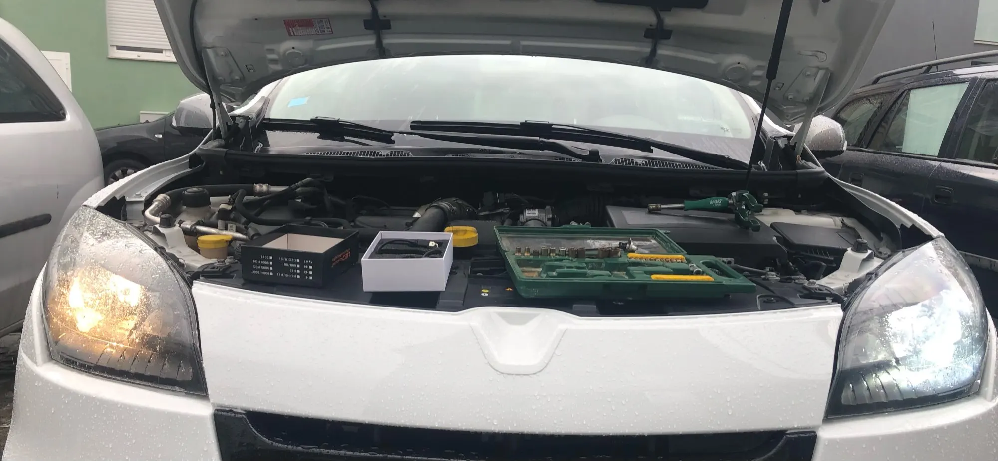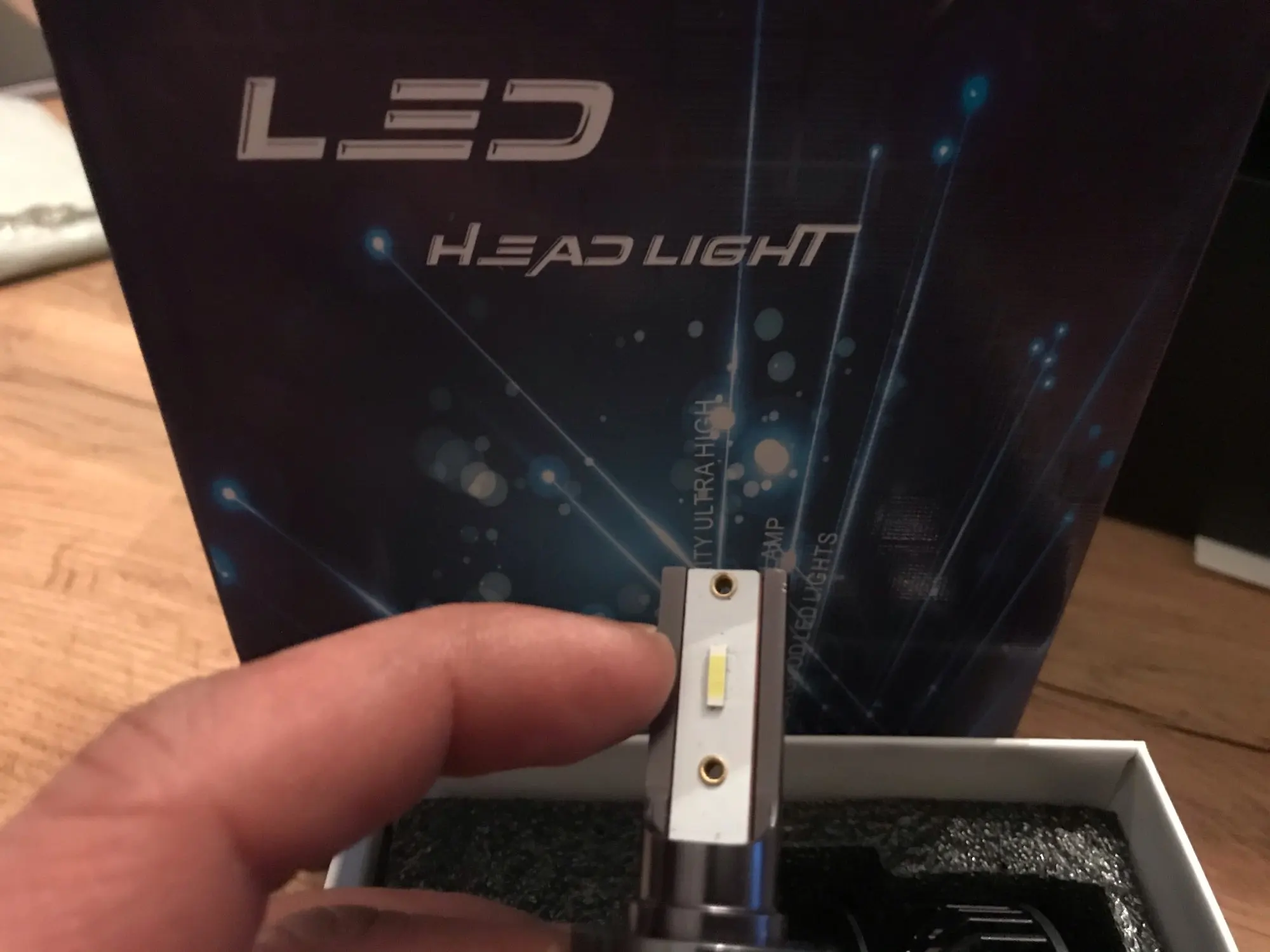Доставлено. Не сломано все безопасно. Простая установка. До сих пор хорошо. Гораздо ярче, чем галогенный лазер osram + 150%. Все еще тестирование качества. Одна проблема с одной светодиодной лампой. Как видно на фото, угол обеих ламп отличается, но некоторые коррекции и все хорошие