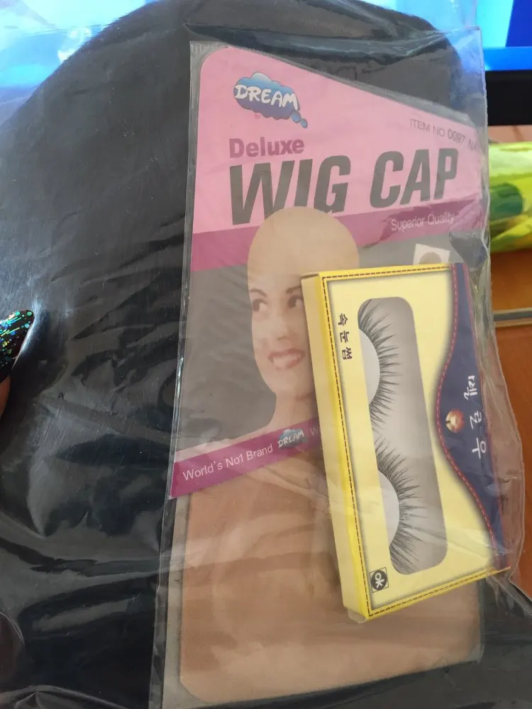 <2en> супер быстрая доставка в соответствии с изображением, я не ожидал, что она будет такой темной, к сожалению, после того, как я выбрал это, но поставляется с двумя эластичными париками и парой накладных ресниц, спасибо
