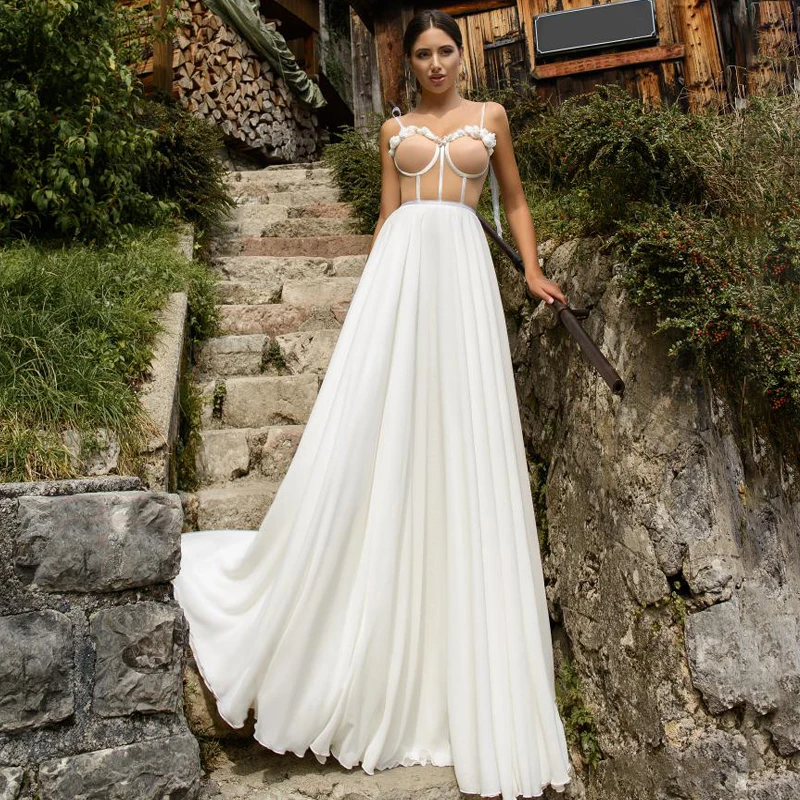 Платье Свадебное ТРАПЕЦИЕВИДНОЕ из тюля на тонких бретельках с цветами