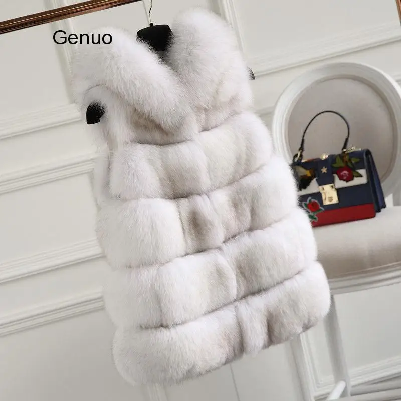 Жилет без рукавов из искусственного лисьего меха с капюшоном, зимние плотные пальто, женская новая мода 2020, повседневная куртка, теплая тонкая женская верхняя одежда из искусственного лисьего меха