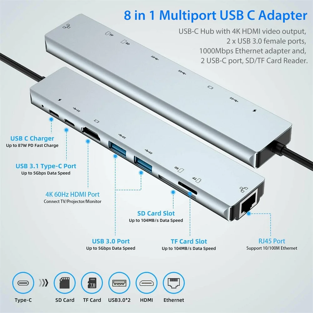 Тип USB-C концентратор 8 в 1 многофункциональный адаптер до 4K HDMI...