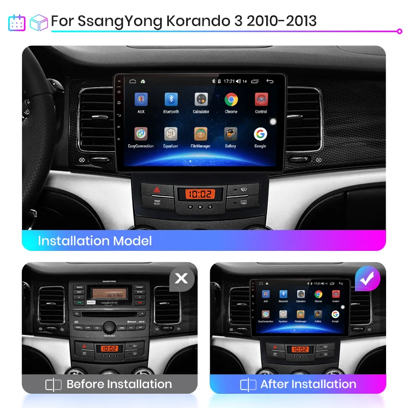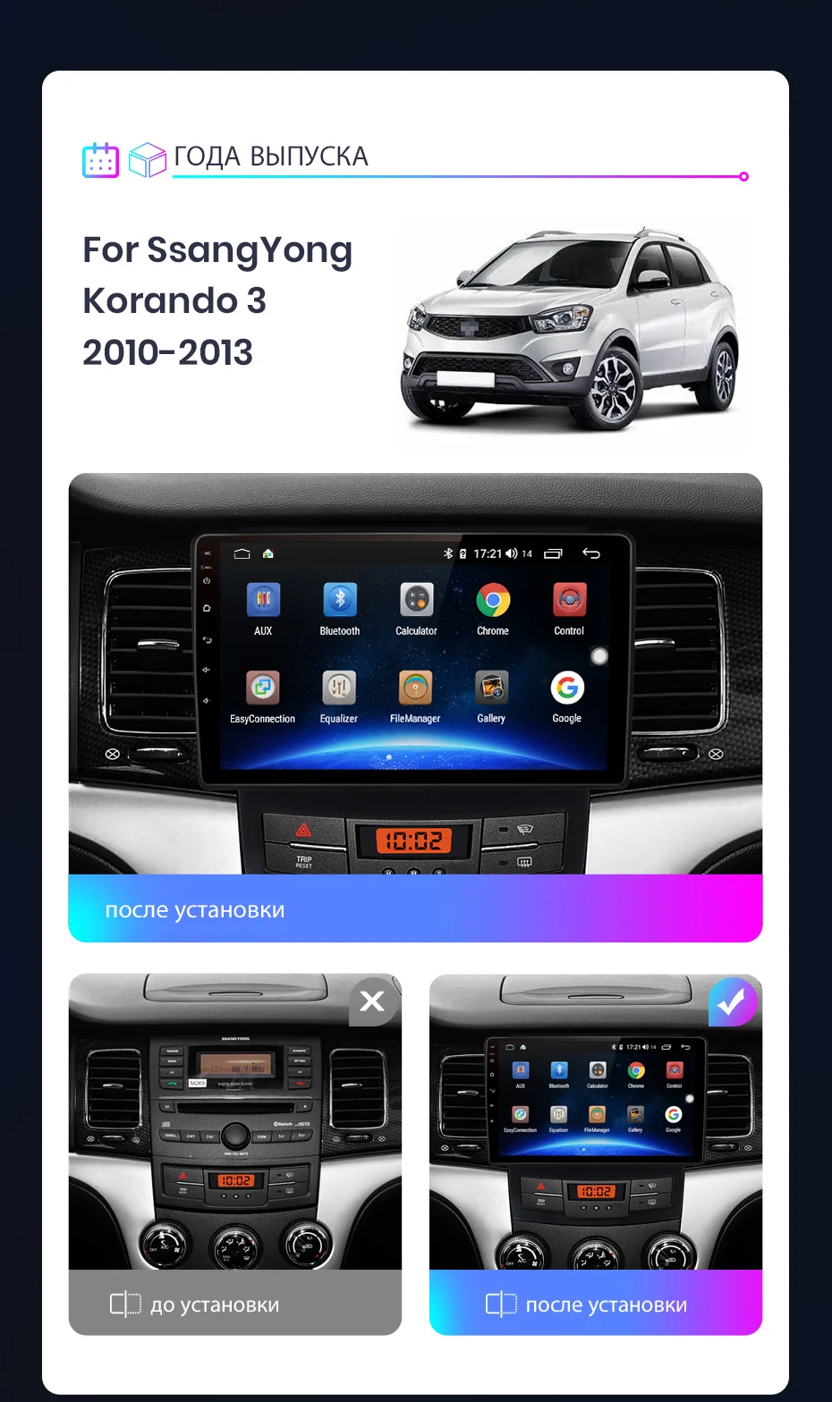 Магнитола супер5+++++ SsangYong 2013 Korando CK Встала в штатное место с небольшими доработками ( просверлил два доп. отверстия для соединения крепления от новой магнитолы к старым креплениям) Много настроек в которых надо разбираться. Продавец очень общительный, отвечает на любые вопросы. Продавца РЕКОМЕНДУЮ.
