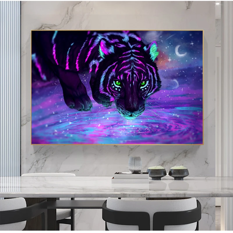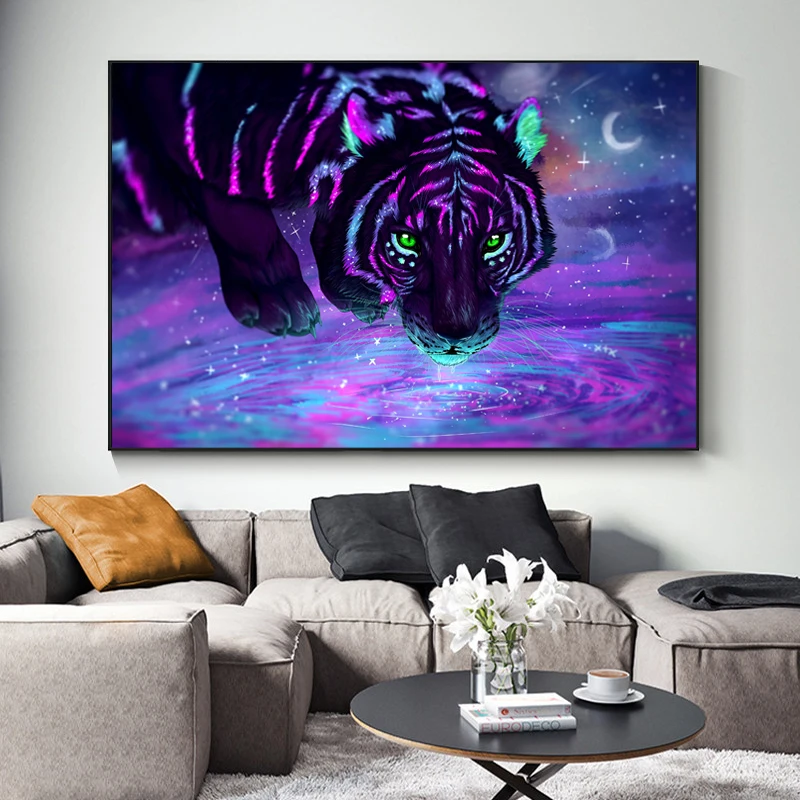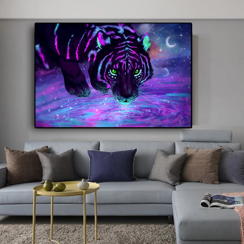 Тигр фиолетовый цифровой искусство зеленые глаза холст живопись Современные животные настенные картины для гостиной плакаты и принты Декор