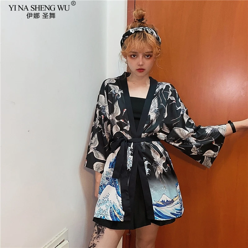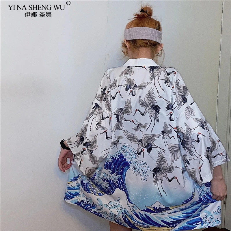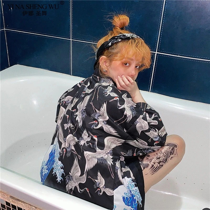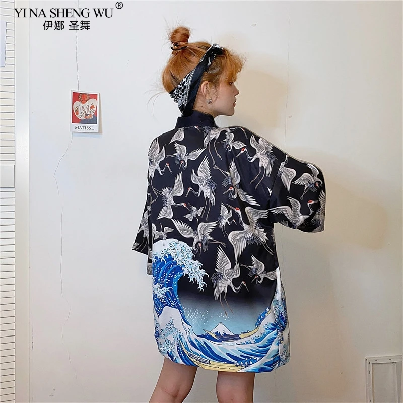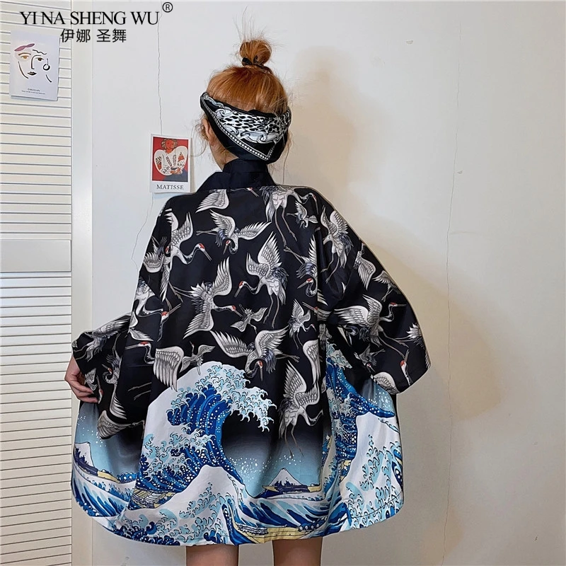 2020 кимоно с принтом журавлей, кардиган для женщин и мужчин в японском стиле, Obi Yukata, черная, Haori, традиционная Летняя Пляжная блуза, пальто
