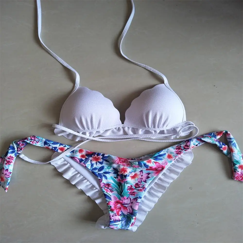 Женский комплект бикини, купальник из ребристой ткани, шикарный, с рюшами, на шнуровке, пуш-ап, топ, бразильские штаны, купальники, оптовая продажа от производителя
