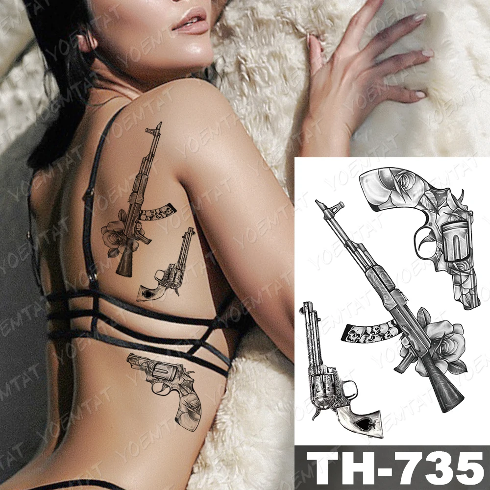 Водонепроницаемые временные татуировки наклейки пистолет пион роза цветок Механическая Вспышка татуировки женский холодный боди арт поддельные тату мужской