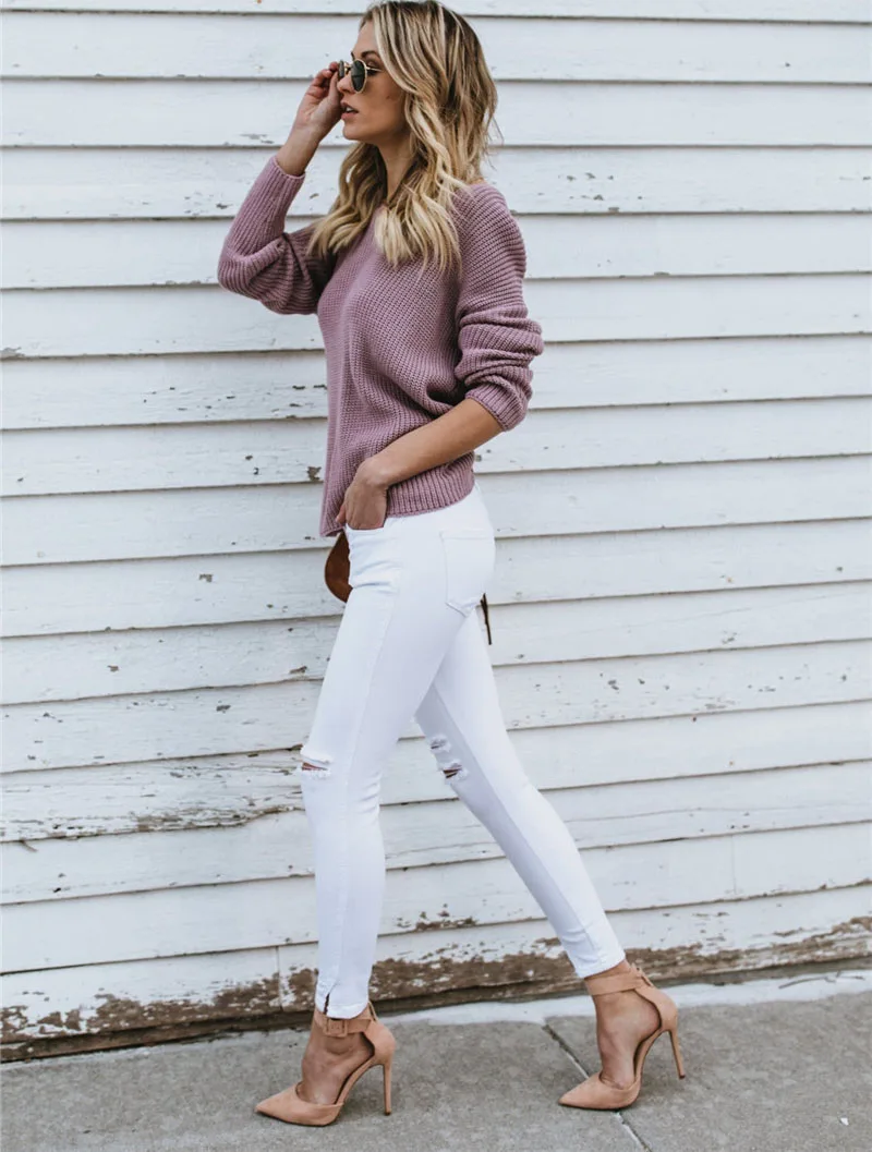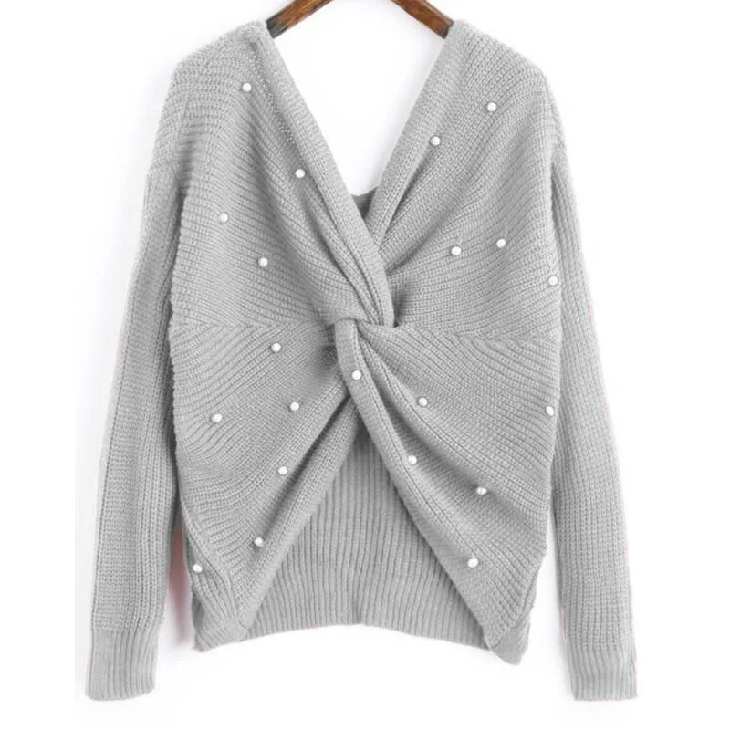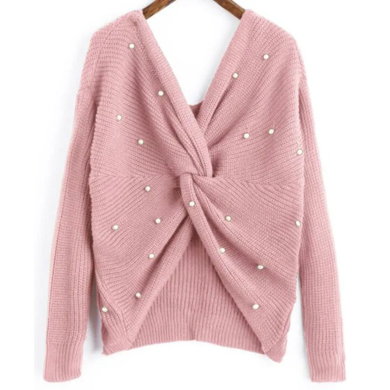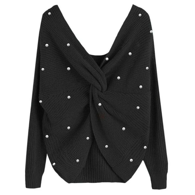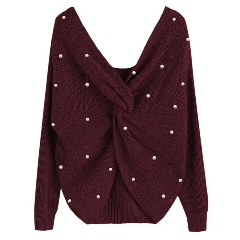 2022 Женский вязаный свитер с перекрещивающимися бусинами на спине осень-зима, элегантный теплый пуловер из органической кожи, модный однотонный джемпер, трикотажный пуловер