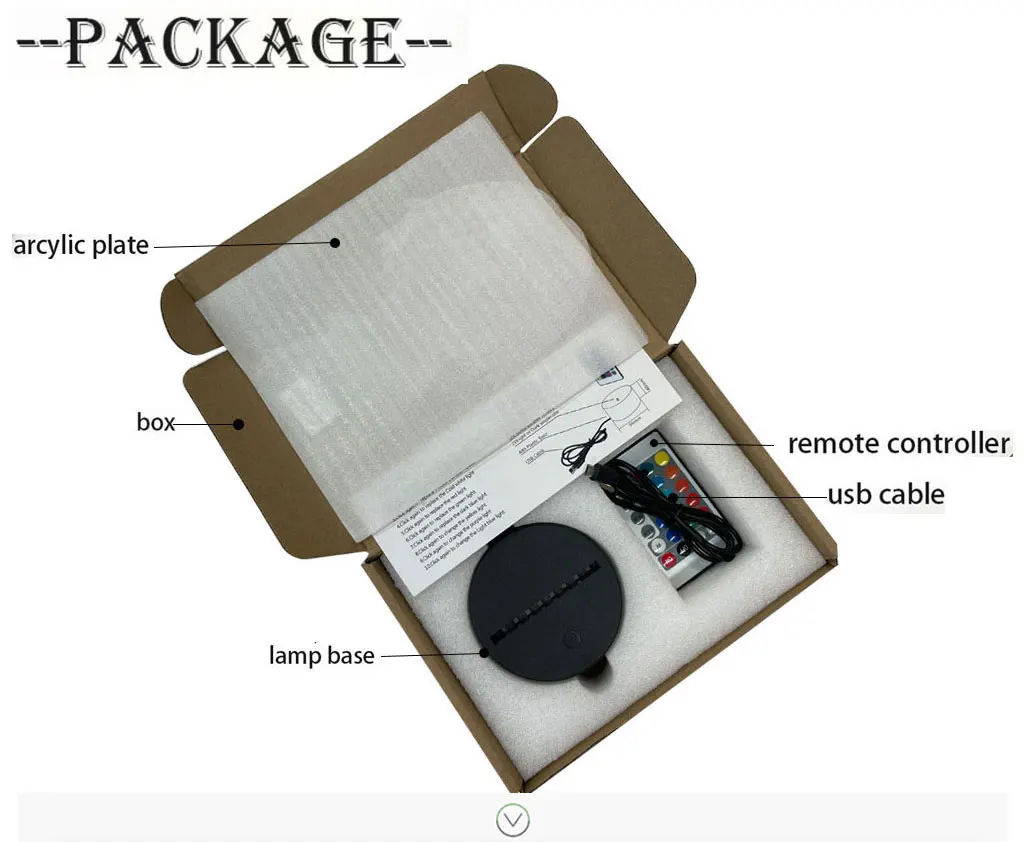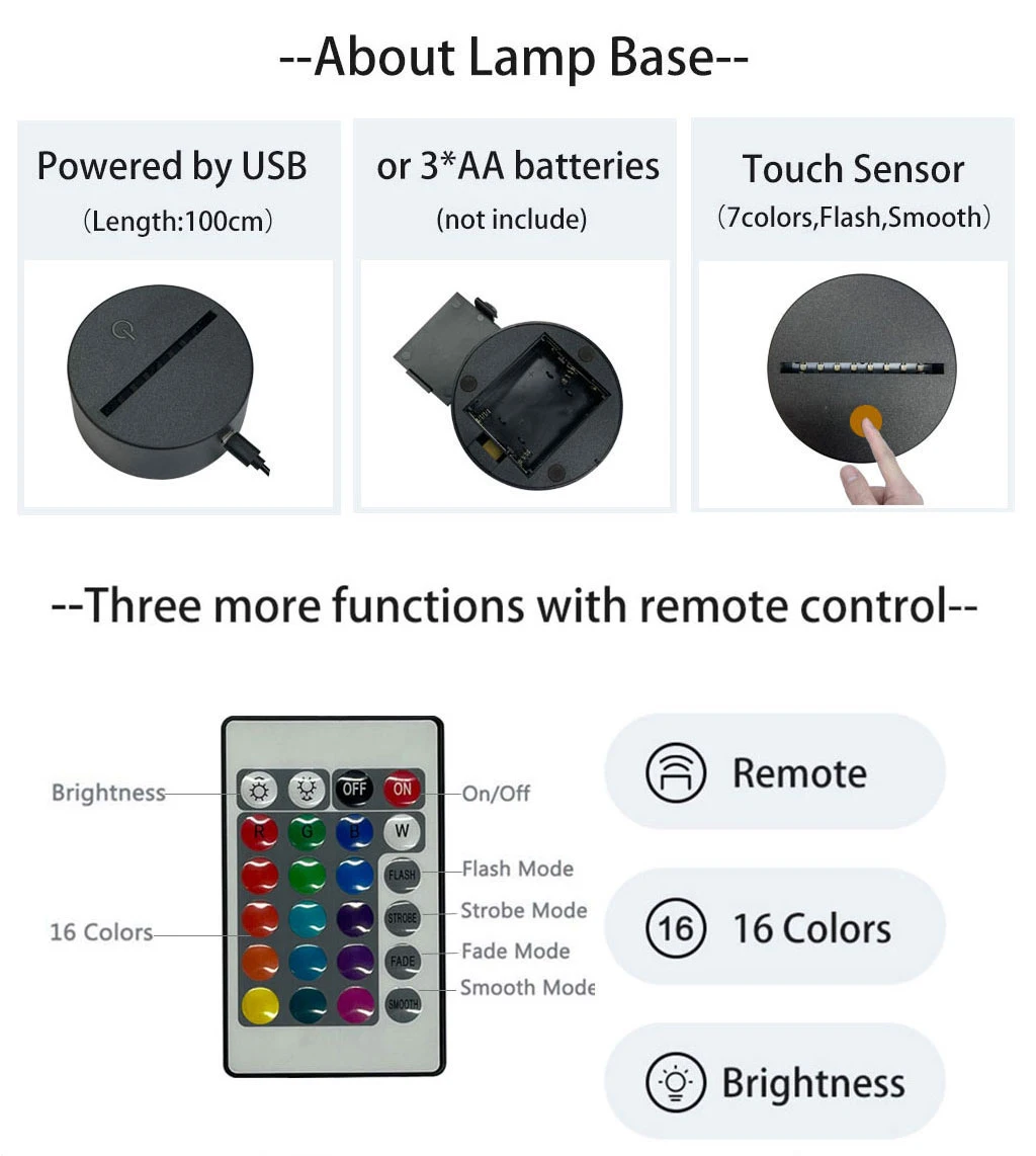 Основные характеристики:Изменение 7 цветов: красный, зеленый, синий, желтый, голубой, фиолетовый и белый⑤ Сенсорный режим: пожалуйста, нажмите сенсорную кнопку один раз, чтобы изменить один цвет, если нажать 8 раз, цвета будут изменены автоматически. Удерживайте переключатель в течение 2 секунд для выключения.Режим дистанционного управления: дистанционное управление с включением/выключением, 16 цветов, регулируемая яркость, режим вспышки, плавный режим.⑤ Низкое потребление, не нагревается после долгой работы, в источнике света используется светодиодный, светильник мягкий и равномерный, не ослепляет, не мерцает, не повредит глаза.⑤ Ночники для детей, девочек, мальчиков, детей, женщин. Широко используется в различных условиях, в качестве декоративного освещения дома, спальни, детской комнаты, гостиной, бара, магазина, кафе, ресторана, вечерние, клуба и в любом другом месте. Или в качестве подарка для детей, девочек, мальчиков, детей, женщин.Параметры:Материал светильник вой панели: оптический акрилПотребляемая мощность: 0012 кВт. Ч/24 часаСрок Светодиодный да: 10000 часовМощность: 0,5 ВтНапряжение: 5 ВЦвет светильник: красный, зеленый, синий, желтый, голубой, фиолетовый, белый (можно зафиксировать один цвет или 7 цветов при постепенном изменении)Потребление: 3 ВтИсточник питания: подключение USB-интерфейса или использование 3 батареек AA (не входят в комплект)Посылка: 22 см * 16 см * 6 смПосылка входит:✔1 * Оптическая акриловая панель, размер в 200*150*4 мм✔1 * цоколь лампы из АБС-пластика, размер: φ 85*40 мм✔1 * пульт дистанционного управления✔1 * кабель Micro USB, длина: 1 м✔1 * Руководство пользователяОбратите внимание:● Пожалуйста, снимите защитную пленку перед использованием.● Чтобы избежать оставления отпечатков пальцев на поверхности акриловой панели, держите доску только по краю, а не спереди.Чтобы получить потрясающий ночсветильник с 3d-иллюзией, нажмите кнопку «Добавить в корзину» сейчас.Реальная вещь намного лучше, чем на фото!Реальная вещь намного лучше, чем на фото!Реальная вещь намного лучше, чем на фото!