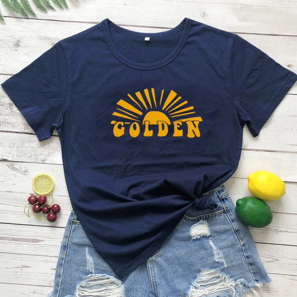 Футболка женская с принтом золотых букв, модная повседневная хлопковая рубашка, рубашка с рисунком солнца, на лето
