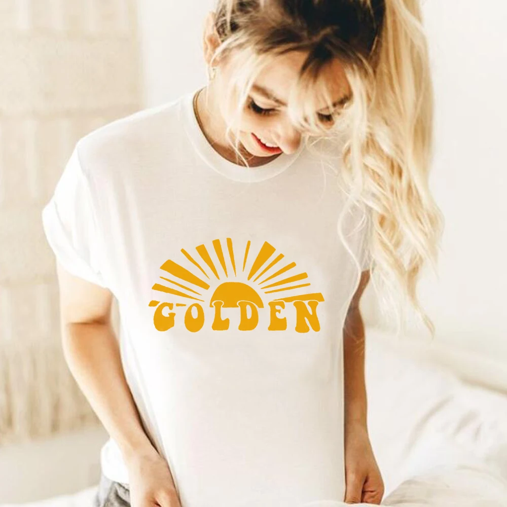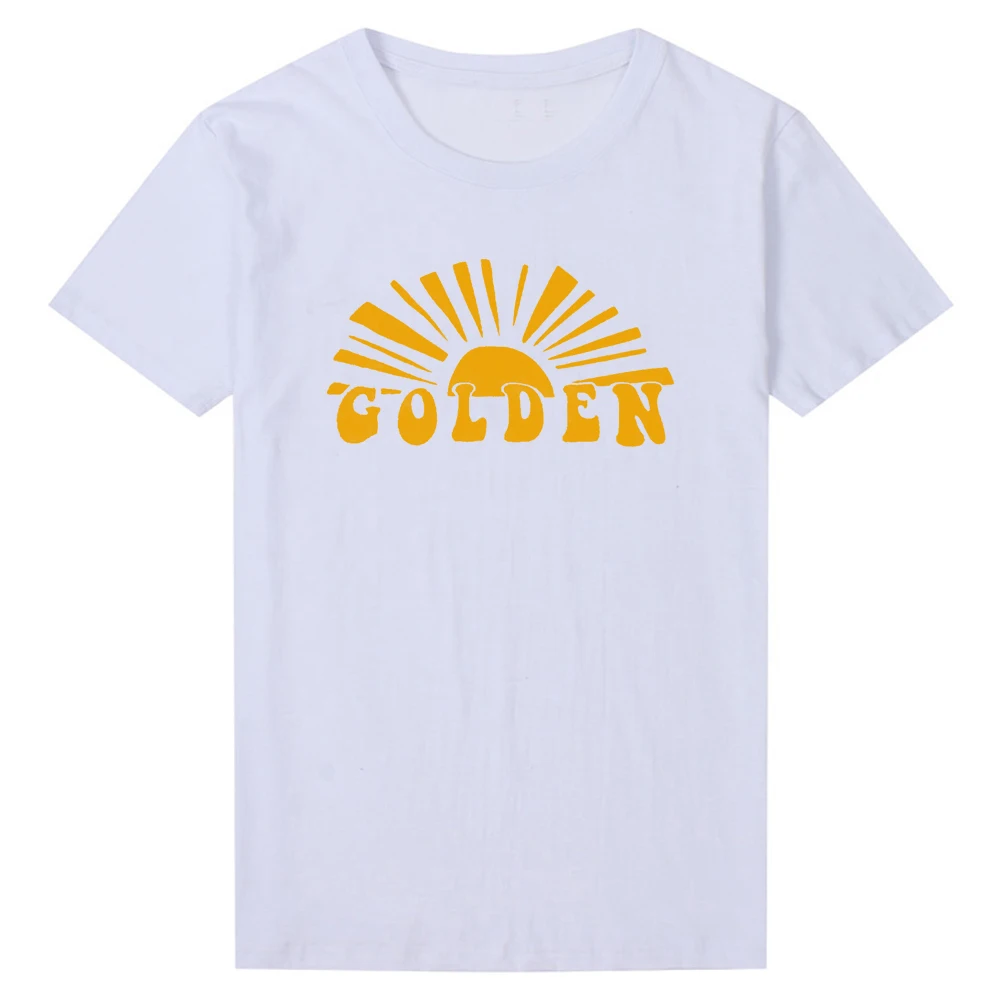 Женские летние модные футболки с принтом золотых букв, повседневные хлопковые футболки в стиле Гарри Мерч, футболки с изображением солнца
