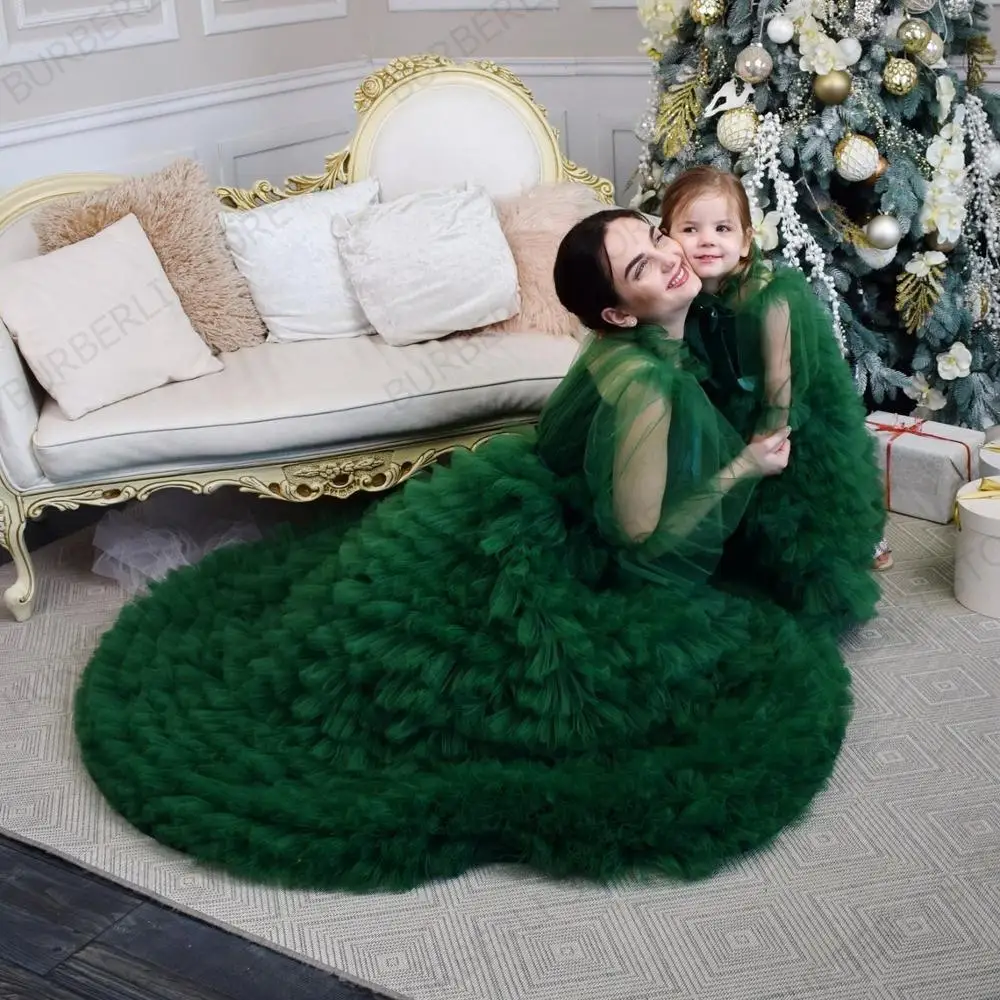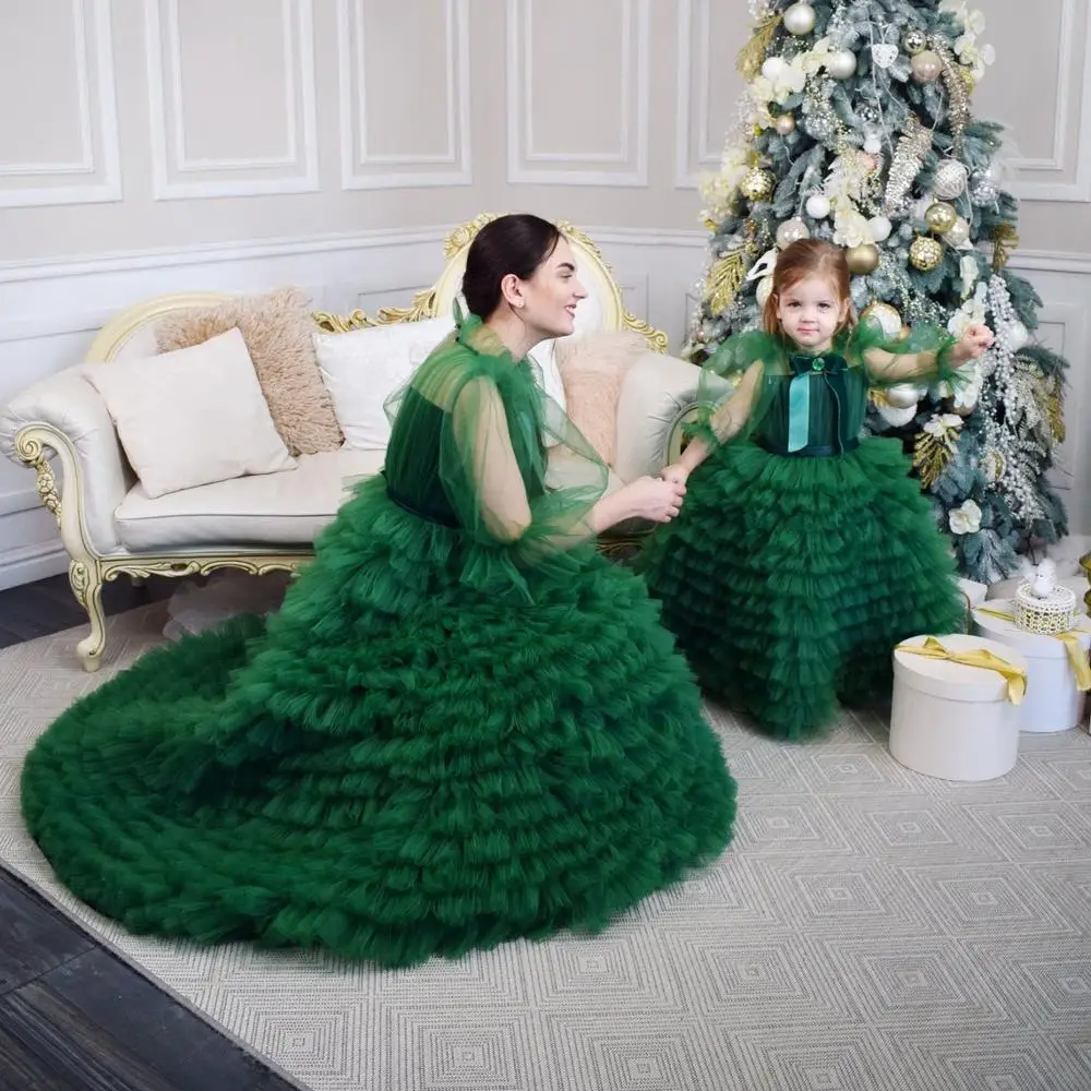 Пышное Тюлевое платье для мамы и дочки, трапециевидные платья с оборками в несколько рядов, пышное вечернее платье до пола с бантом, изготовление на заказ