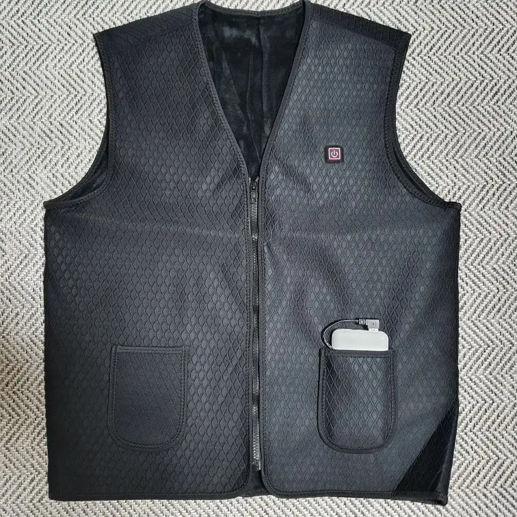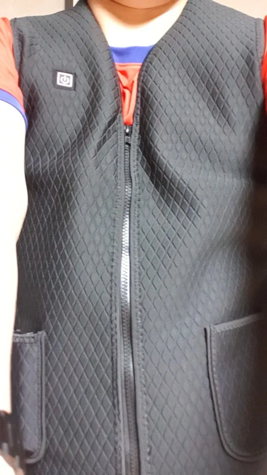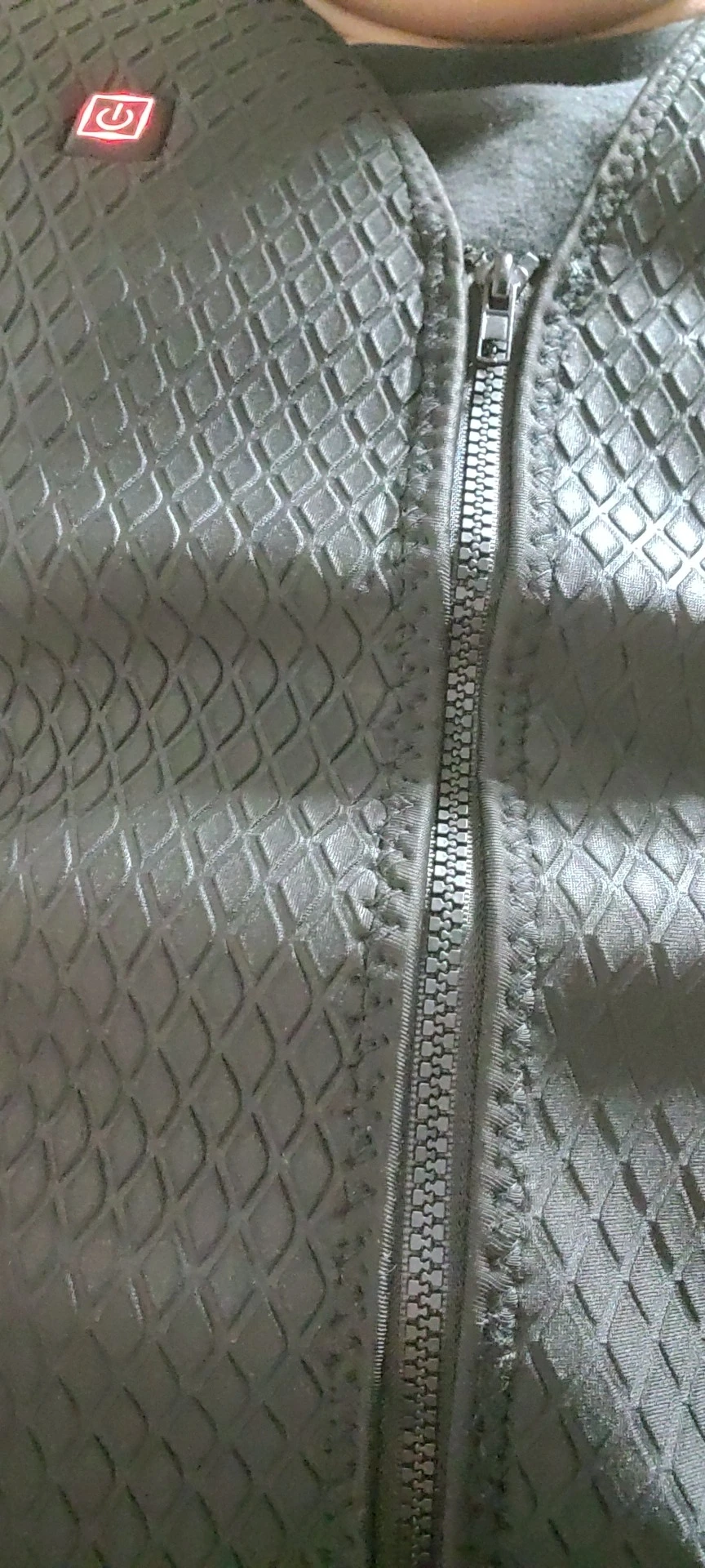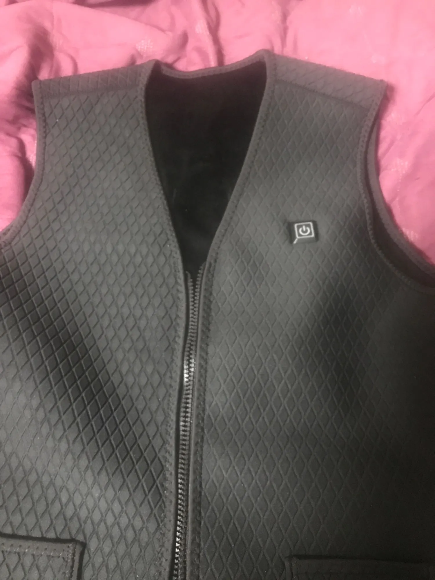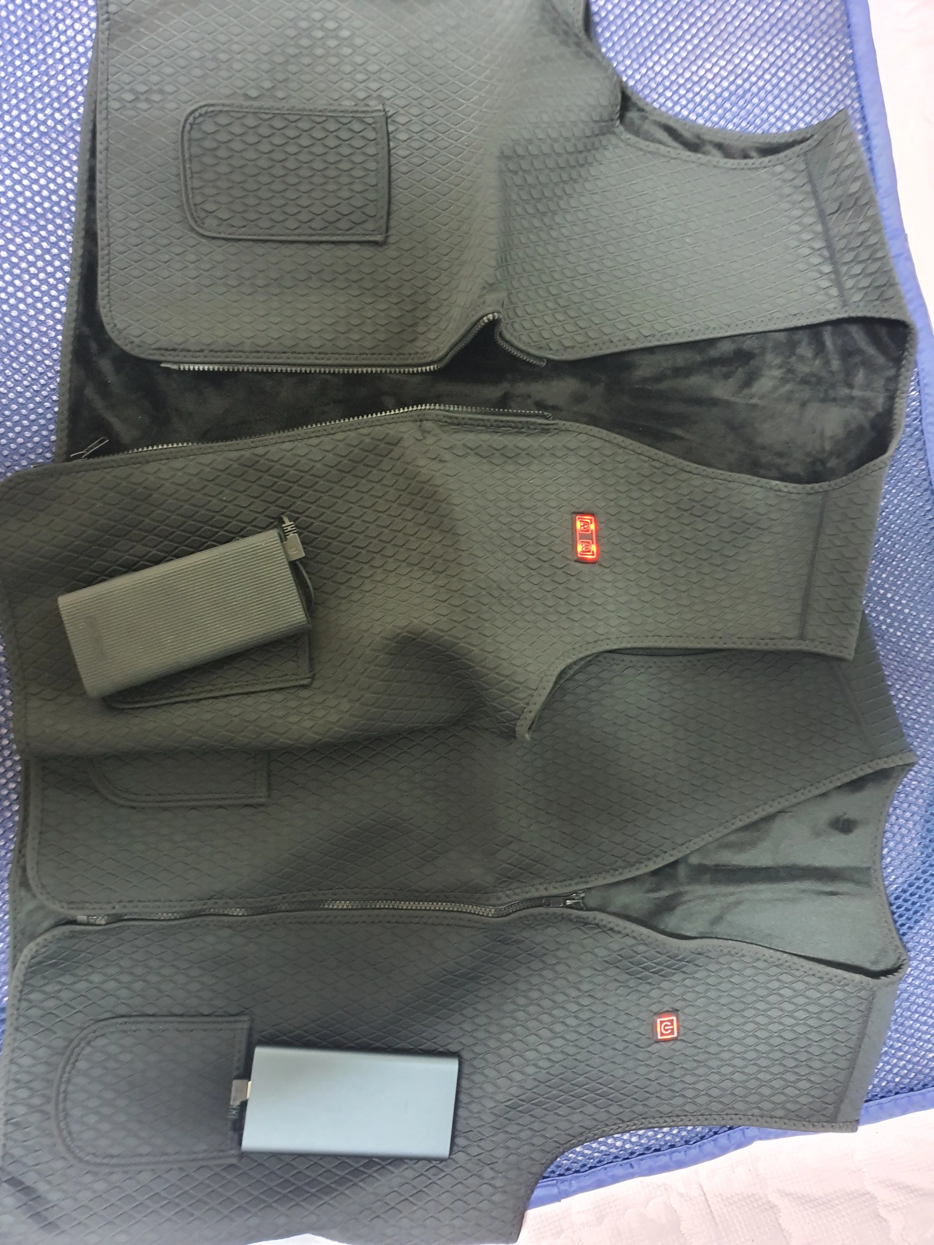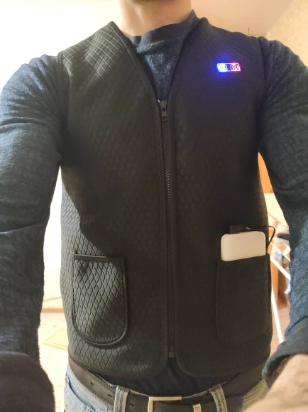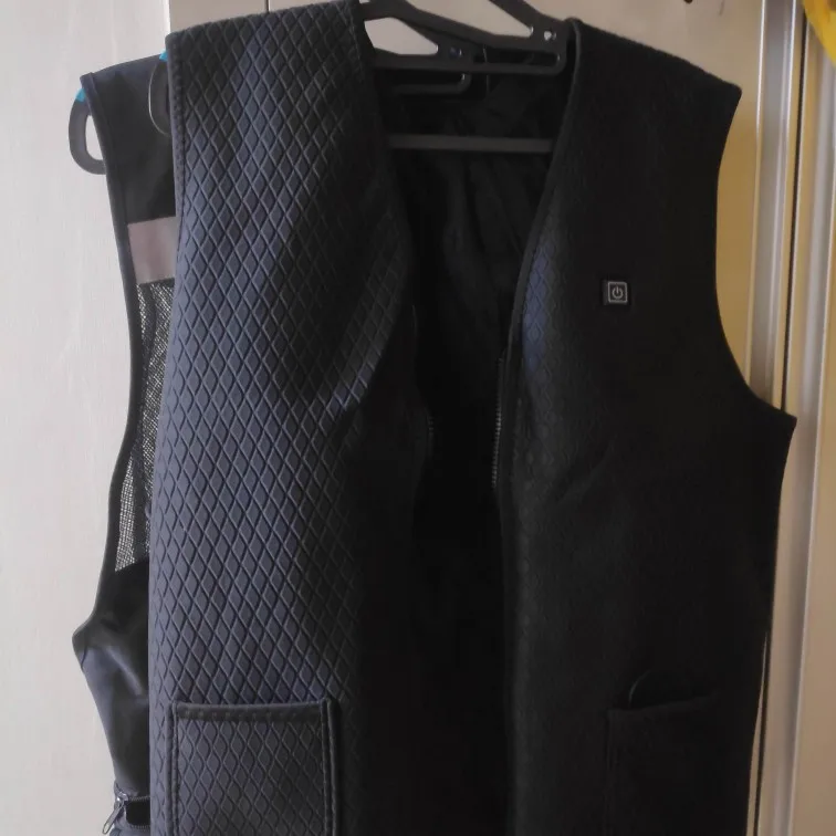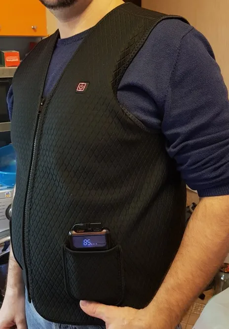 Доставка 12 дней, в СПб, принесли домой, хотя должны были прислать в пункт выдачи заказов. Жилет отличный, качественно сшит, имеется мягкая тёплая подкладка, материал плотный, имеет не большой запах, но не резины. Не много отличается от фото, на этом две кнопки включения, первая включает два нагревательных элемента в районе плеч, вторая включает остальные пять элементов, довольно удобно. В передней части находится два нагревательных элемента, под карманами, остальные на плечах и в задней части. При проверке не зарядил аккумулятор, было 23% поэтому подогрев не включился, зарядил до 80% всё нормально заработало. Есть три режима нагрева, на максимальном режиме за 15-20 минут схомячил 12% (10000mAh, аккуму 1 год) Брал XXL, рост 178, вес 65, талия 100. Греет хорошо, в идеале чтобы облегал, тогда эффект будет более эффективный, одеваю на футболку а поверх флиску, очень тепло.