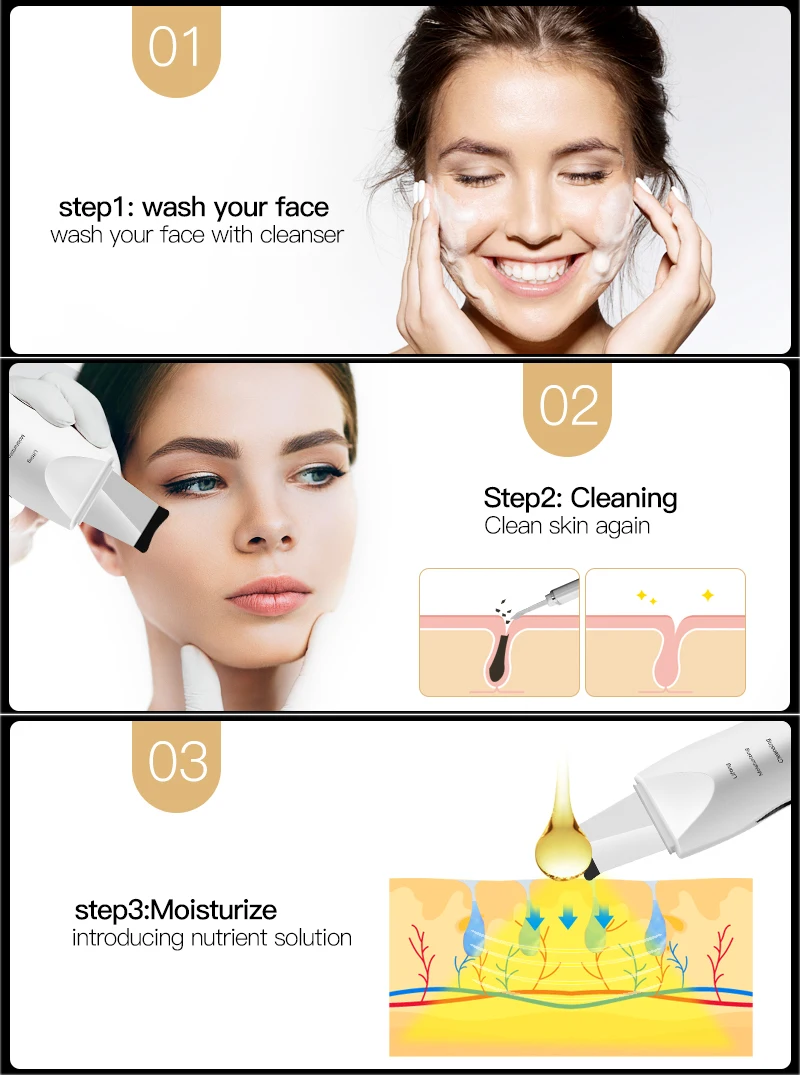 Ультразвуковое высокочастотное колебание используется для мгновенного распыления воды, а распыленная вода проникает в глубокий слой кожи для удаления грязи и регулировки баланса воды и масла, для достижения эффекта очистки засоренных пор, удаления черных точек и очищения кожи.