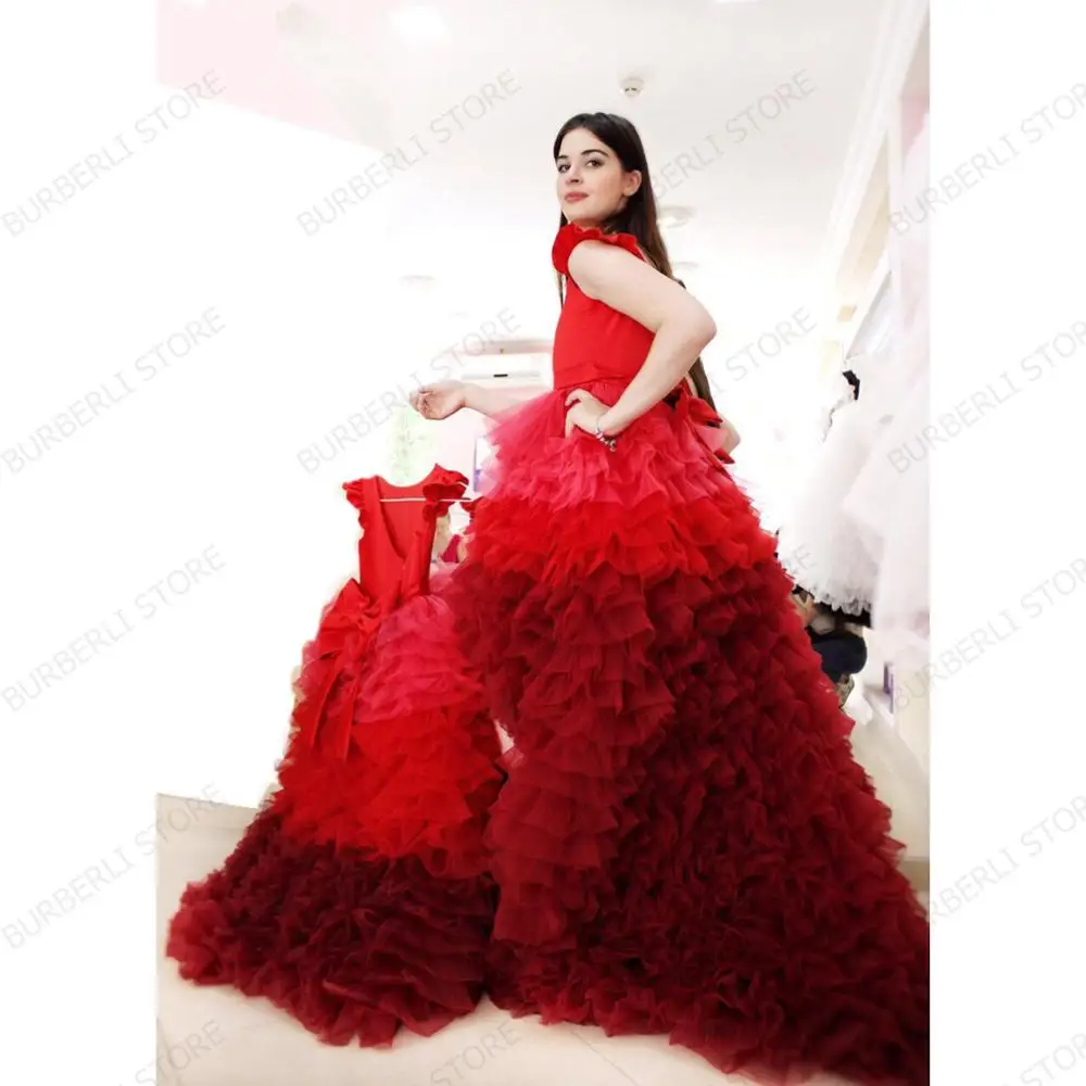 Красное Тюлевое Пышное Платье Mommy Me, платья а-силуэта с оборками в несколько рядов, красочное Пышное вечернее платье с бантом, изготовление на заказ