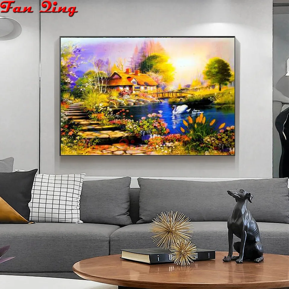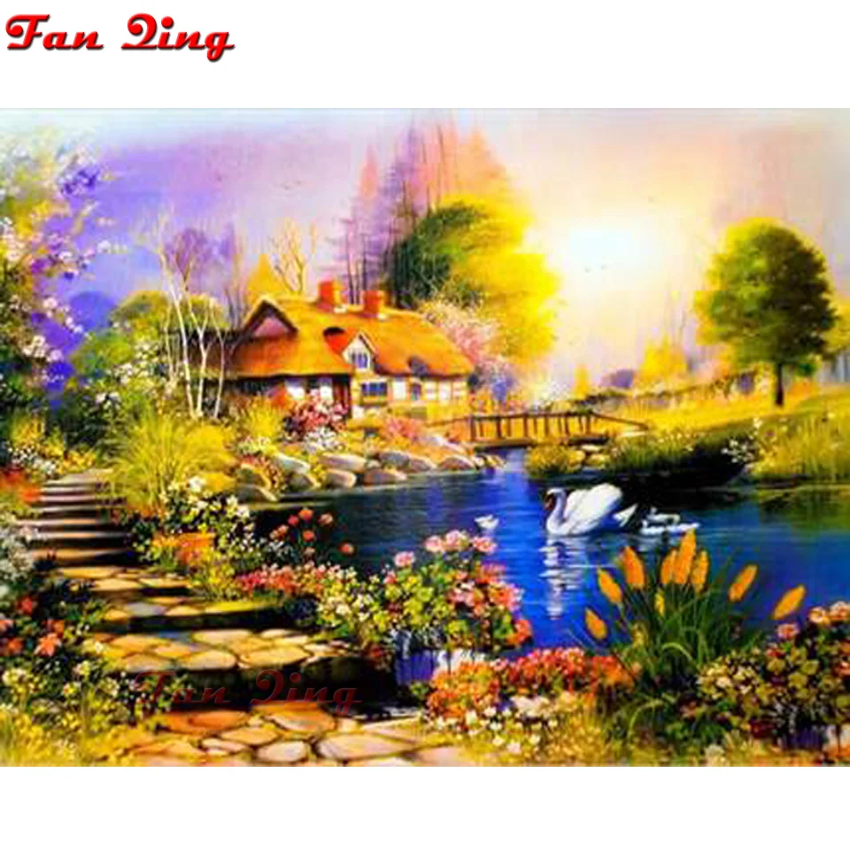 3D Алмазная картина, вышивка крестом, деревенский дом, озеро, лебедь, хрусталь, рукоделие, алмазная вышивка, полностью Алмазная декоративная вышивка