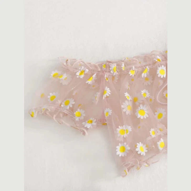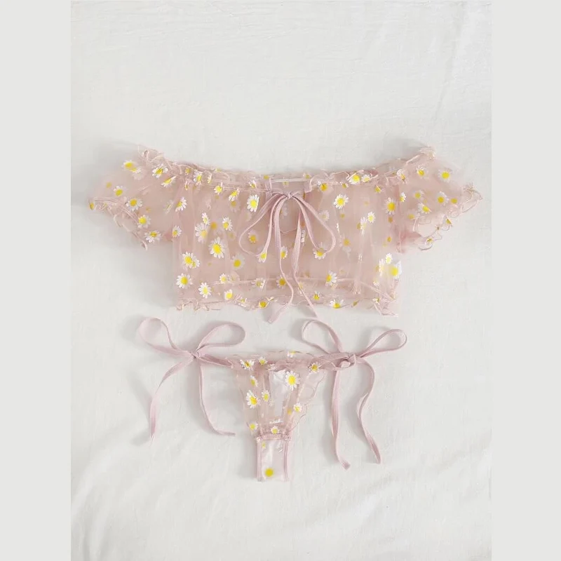 Комплект женского нижнего белья из 2 предметов, сексуальный прозрачный укороченный топ с открытыми плечами и цветочным принтом с ромашками и бантиком, трусики с завязками на талии, комплект нижнего белья