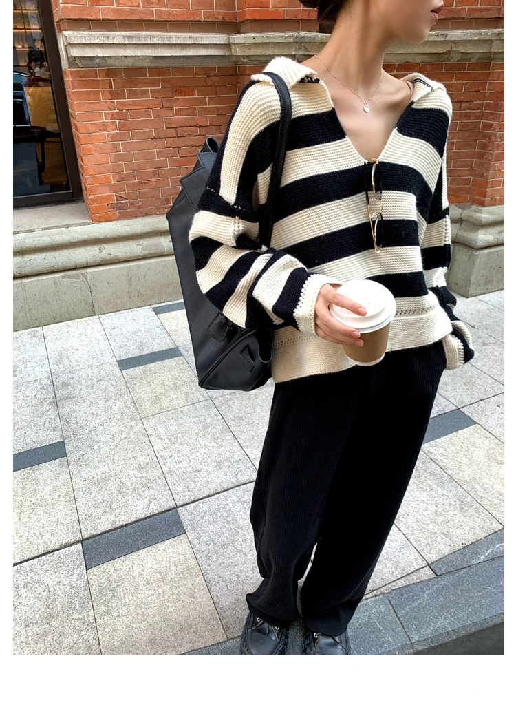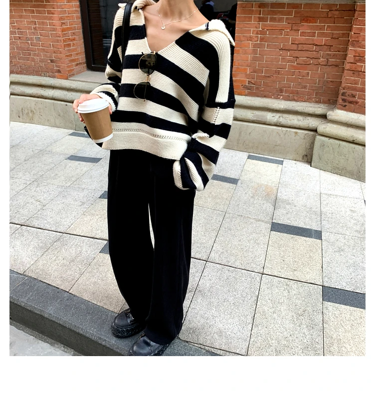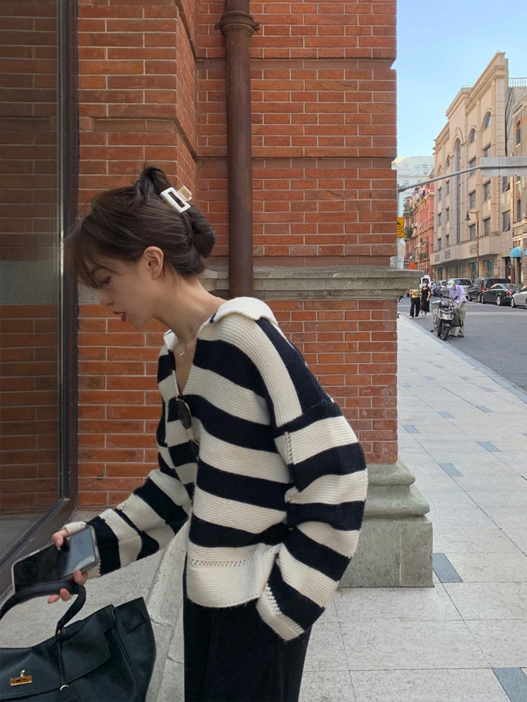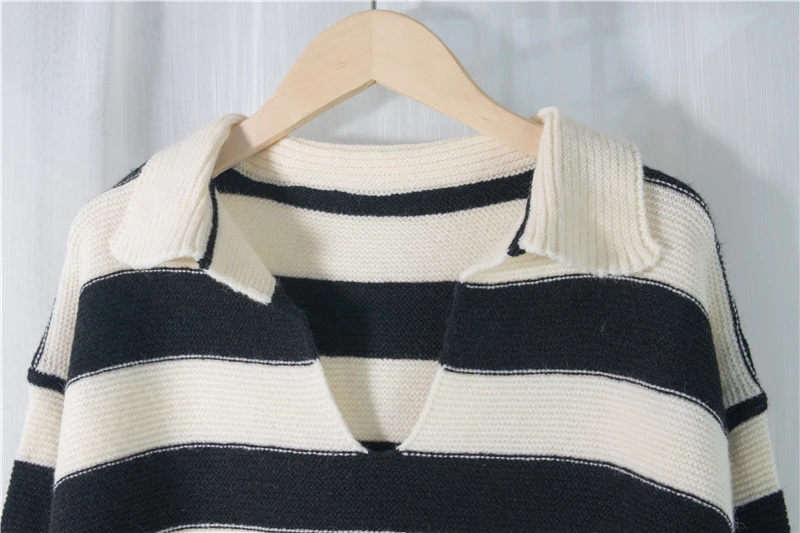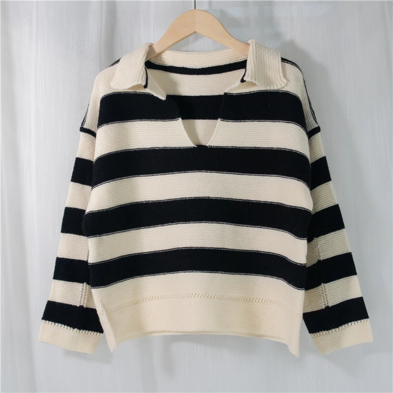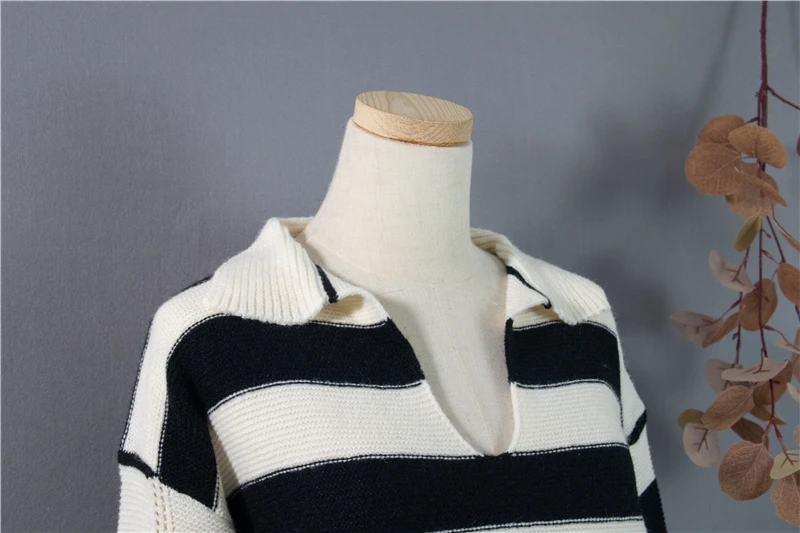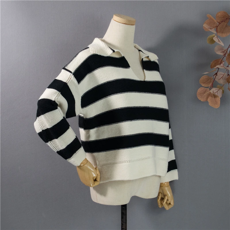 Свитер женский трикотажный в полоску, с воротником-поло, Осень-зима, SW1181, 2021