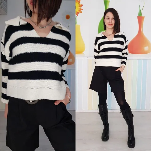 Свитер в полоску, многих он мог ввести в заблуждение тем, что на главной фотке миниатюрная девушка и на ней посадка оверсайз) Подробный отзыв с видео в инстаграм @jul_sharit и в телеграм канале Джул Шарит - обзоры товаров с Aliexpress ☆ В реальности рукав на рост 168 3/4, свитер укороченный. По качеству вопросов нет, с видео продавца совпадение полное. Не особо теплый, скорее декоративный) Классно смотрится с высокой посадкой брюк, джинс, потому что его не нужно заправлять, талия подчеркнута, а ноги смотрятся длиннее ♡ На 84-71-91 One Size