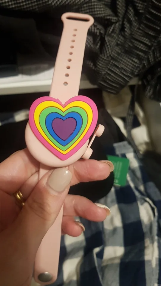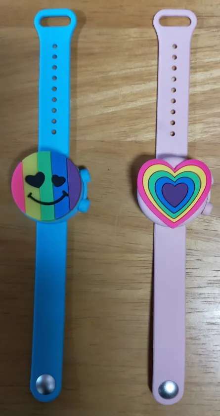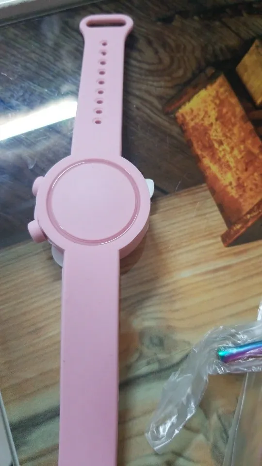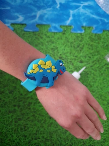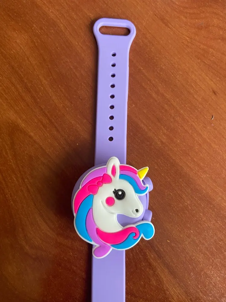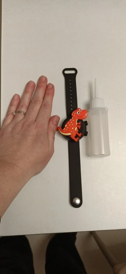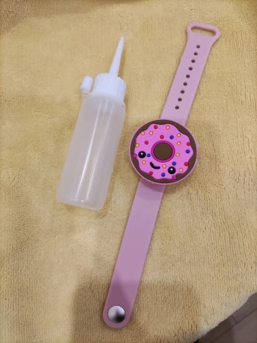 Хороший браслет. Сделали шилом небольшую дырочку в определённом месте, через шприц наполнили гелем-антисэптиком. При надавливании выходит хорошо, не подтекает. Ремешок удобно застегивать на любую руку. Взяла ребёнку, думаю взять себе, чтобы не носить баллончик в кармане. Фото нет, но точно как на картинке. Приятный на ощупь. Рекомендую