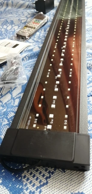 Ну, что же!? Заказ до Владика, 17 дней. Доставка в руки! Упаковка супер. Пупырка, пена, воздух. Товар отвечает заявленному качеству! Этот светильник шестой. Первому третий год, работает как часики! Но на этом как и на предыдущих, желательно перепрошить драйвер. В нете есть инструкция. Родной драйв не совсем корректно расставляет часы. Т.е, световые фазы немного не совпадают. Длинна светильника 73 см. Длинна поля с диодами 66 см. . Аквы 150 л. просвечивают хорошо! Если для ростючки, то для банок не глубоких. Пульт без батарейки. Очень боятся попадания воды, у меня с покрывными стеклами. Если без стекол, то нужно исключить брызги от аэрации. Падения в воду не переживут. Достаточно ощутимо греется. Меня эти светильники полностью устраивают! Продавца рекомендую!