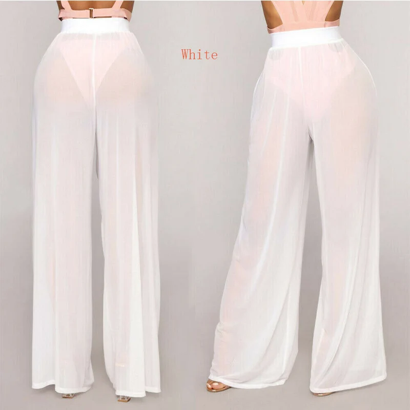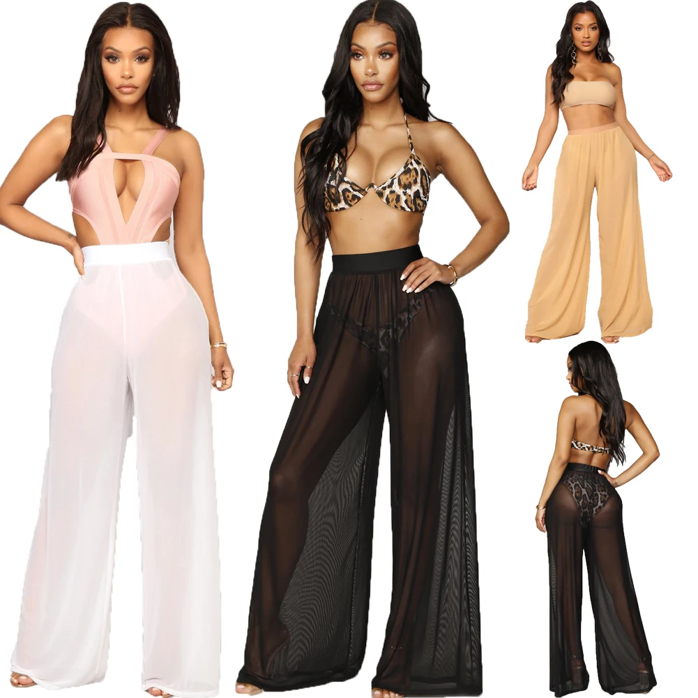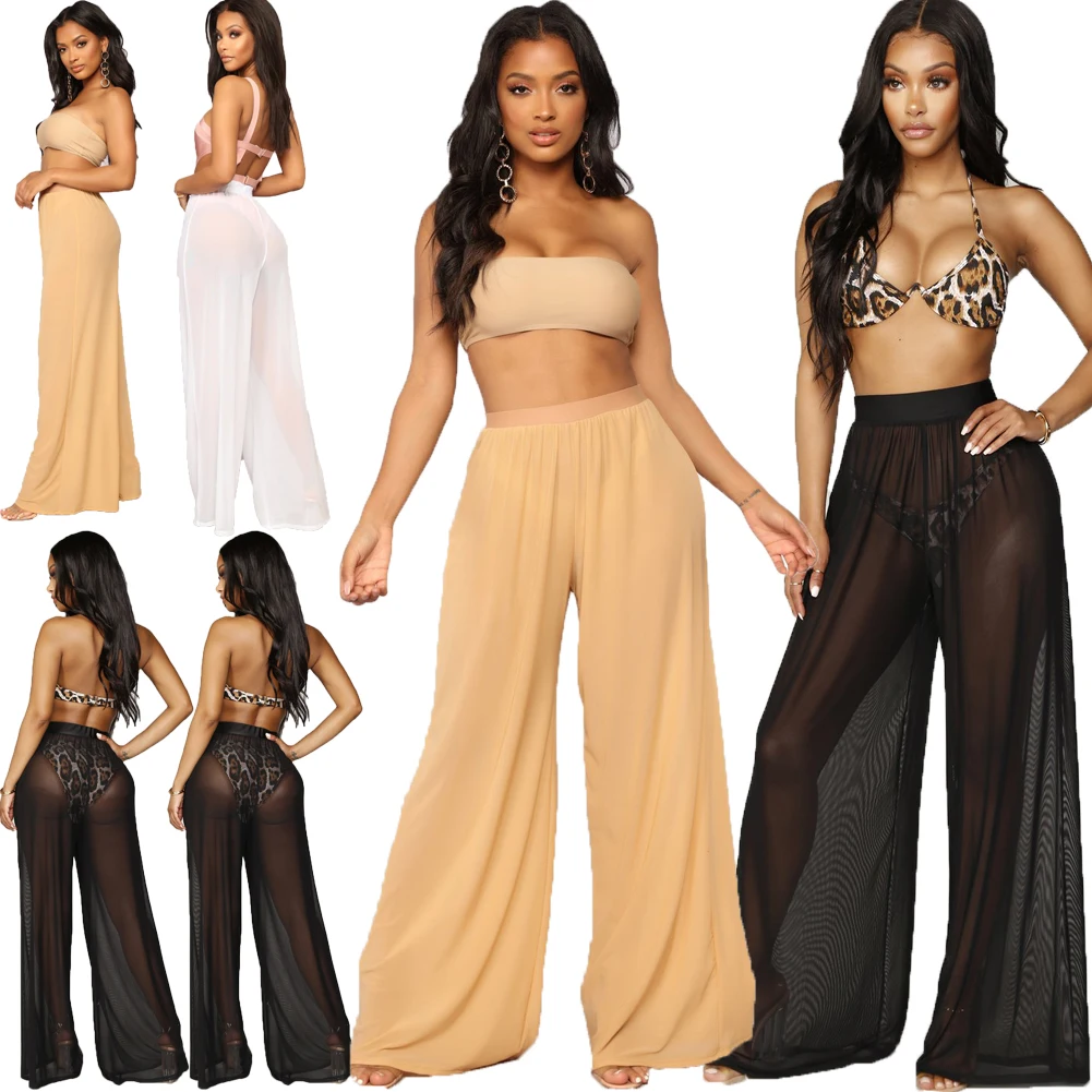 Модный женский купальник с высокой талией, накидка на бикини, прозрачные однотонные широкие сетчатые кружевные длинные брюки