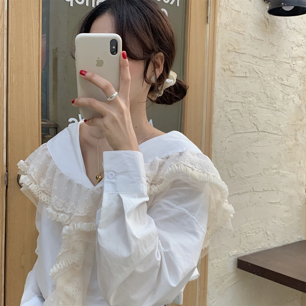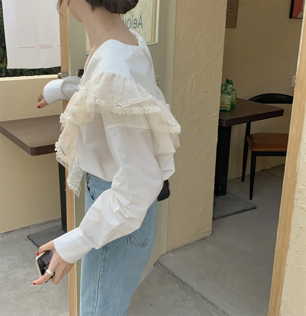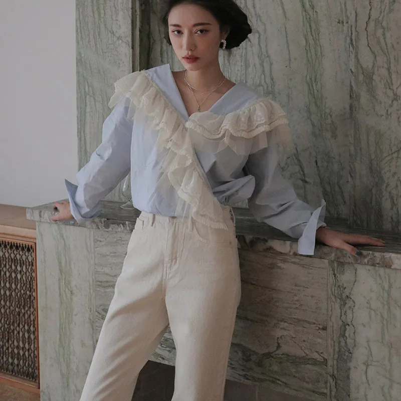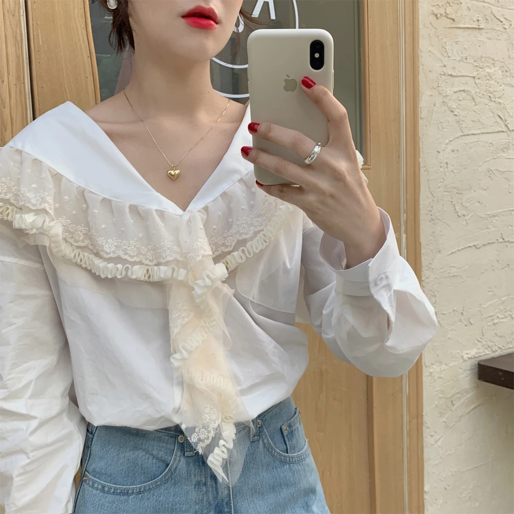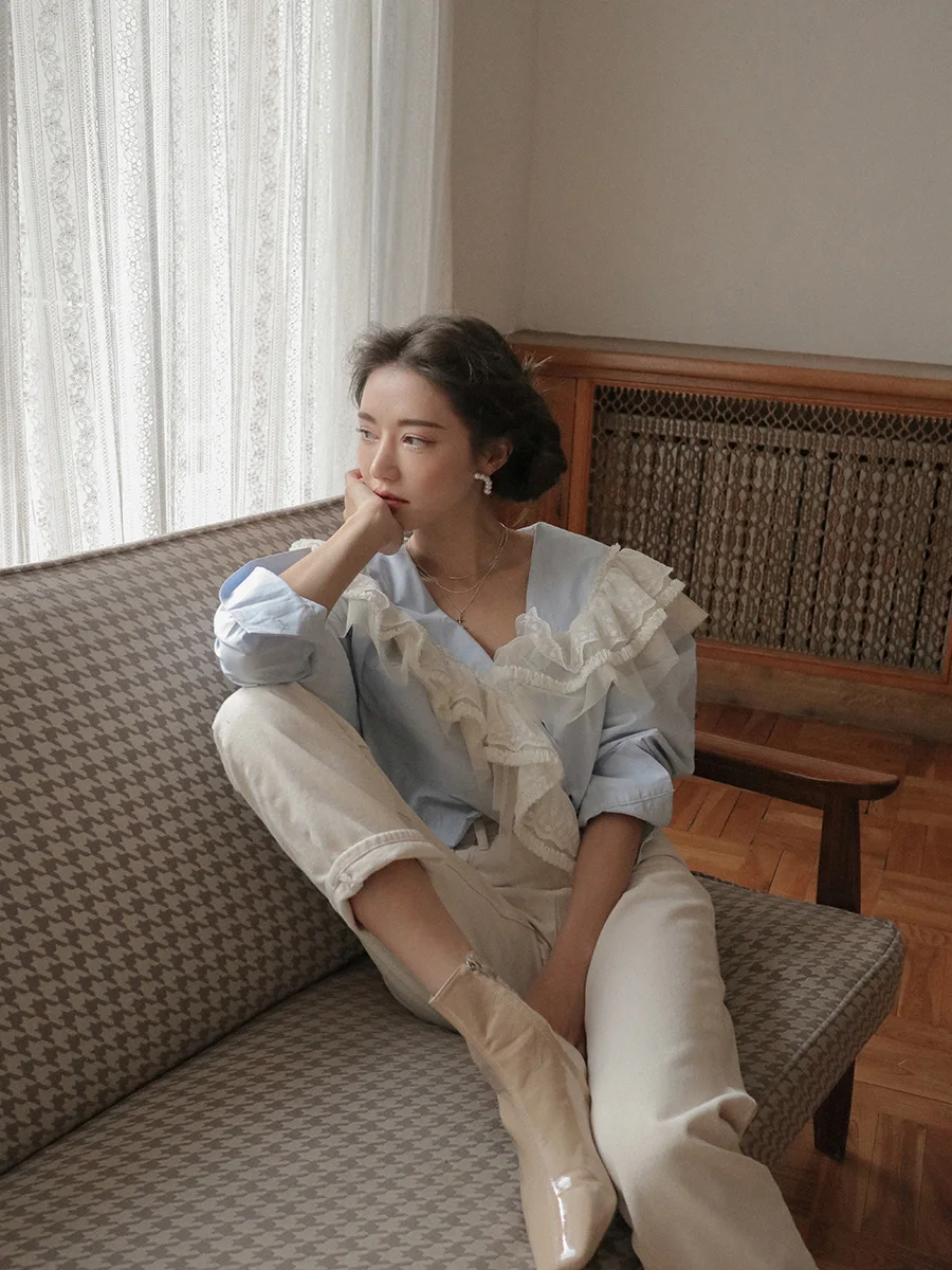 Блузка Alien Kitty Женская с V-образным вырезом, Повседневная рубашка в Корейском стиле, мягкая однотонная модная шикарная блузка с кружевом и оборками, 2021