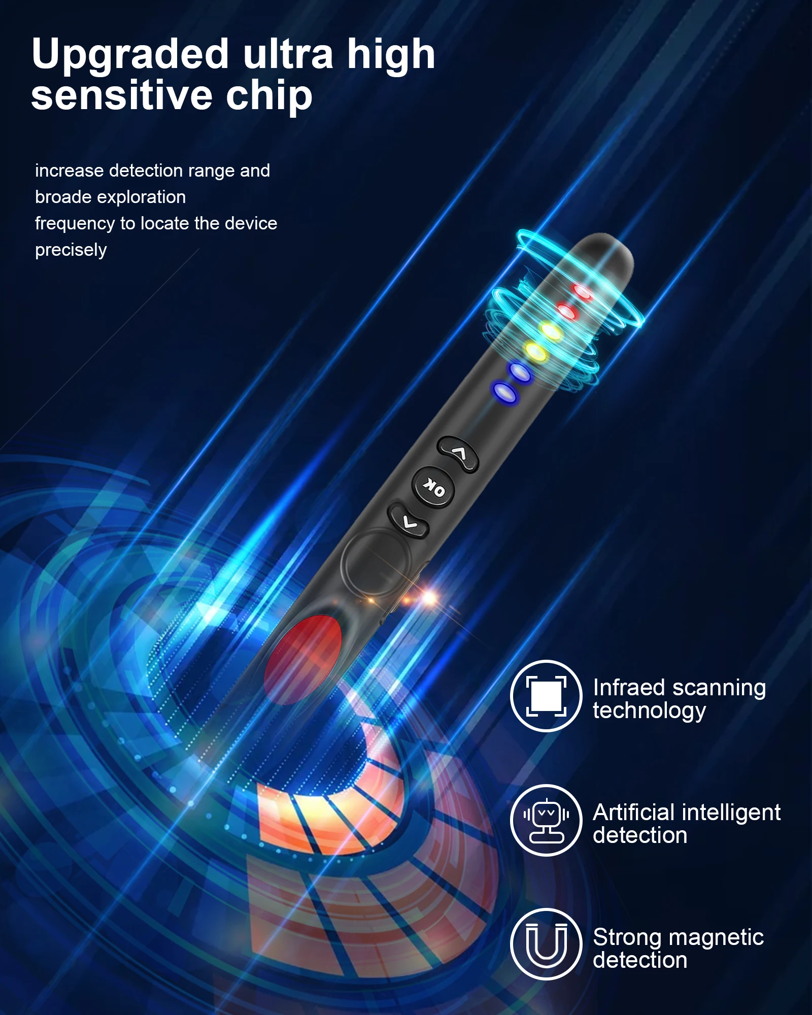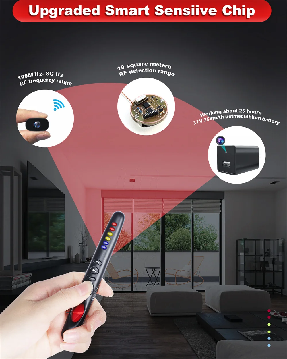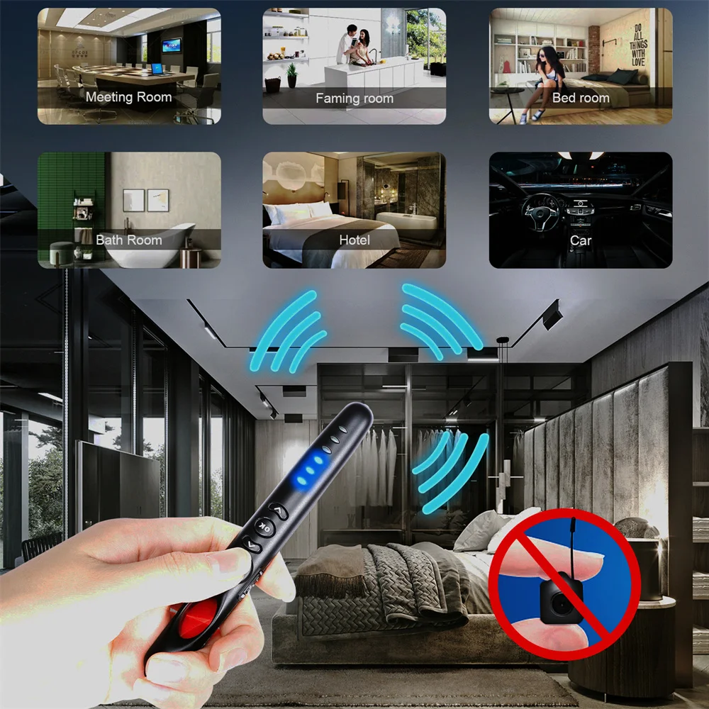 Радиочастотный детектор и персональная сигнализация G718 отлично подходят для вас, устройство имеет 3 функции:1. Обнаружение радиочастотных сигналов, Скрытая мини-камера WiFi, ошибки сигнала мобильного телефона и беспроводное устройство прослушивания2. Сканирование объектива камеры Pinhole, поиск проводных камер pinhole (которые не выводят беспроводные сигналы) в отеле, дома, офисе3. Дверная сигнализация и багажное оповещение, устройство встроено в вибродатчик для сигнализации сразу же, когда датчик срабатывает