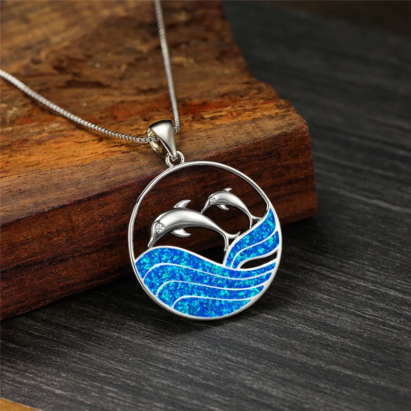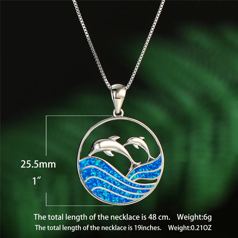 Ожерелье с подвеской в виде двойного дельфина из голубого огненного опала для женщин и мужчин, украшение в виде животного, женское свадебное ожерелье для помолвки, рождественские подарки