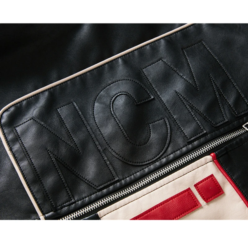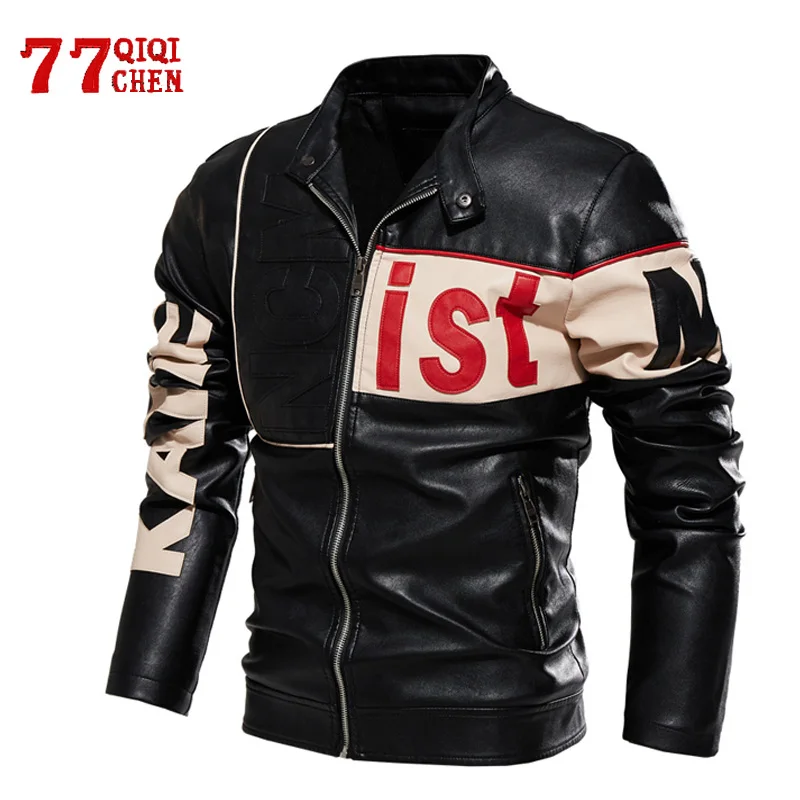 Мужская зимняя куртка из искусственной кожи, мотоциклетная куртка с надписью на флисе, с воротником-стойкой, ветровка в стиле пэчворк, мужской тонкий жакет
