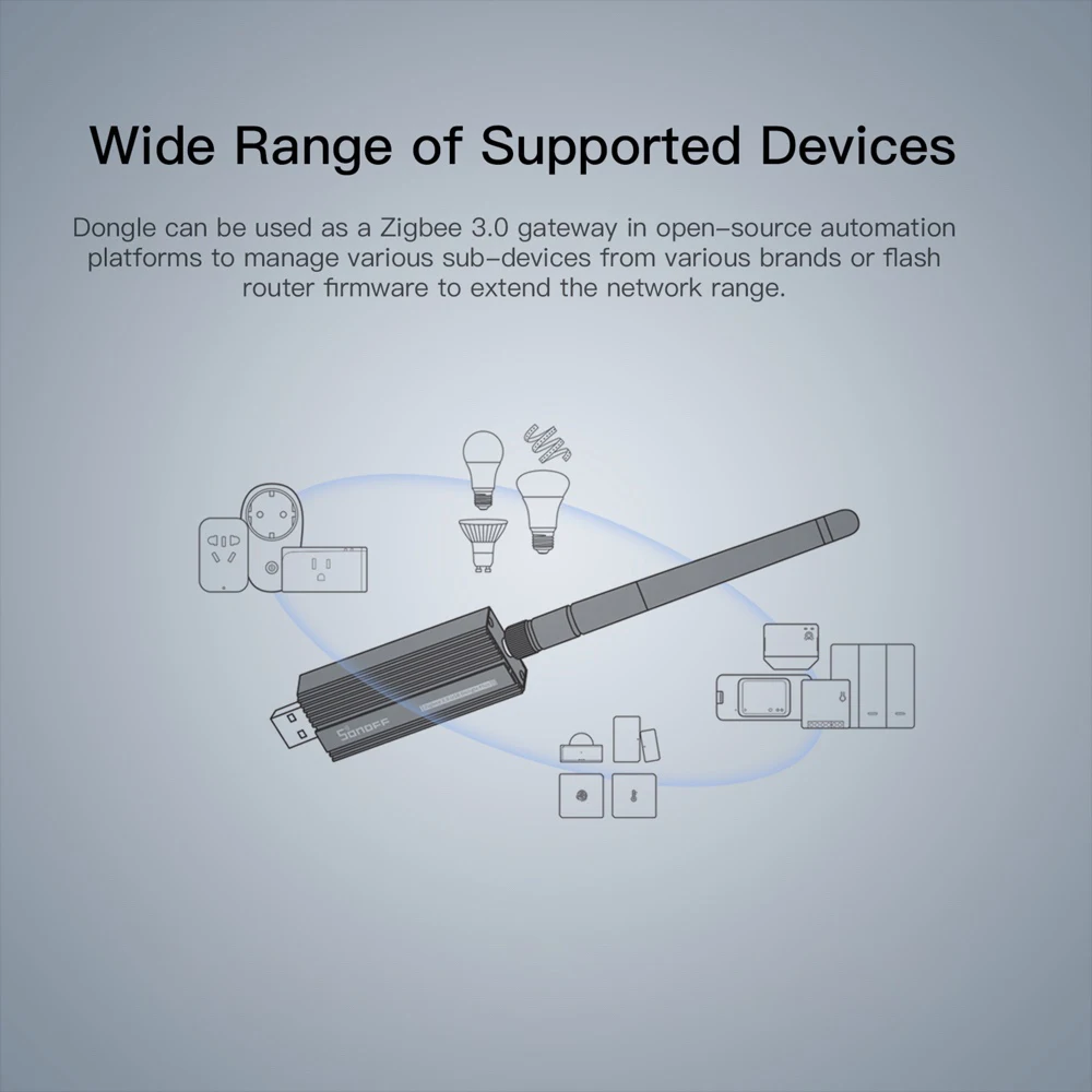 Донгл плюс имеет широкий спектр поддерживаемых устройств, таких как BASICZBR3, S31 Lite zb, SNZB01, SNZB02, SNZB03, SNZB04, ZBMINI, S26R2ZB, И различные вспомогательные устройства от различных брендов или флэш-маршрутизатор прошивки для расширения диапазона сети.