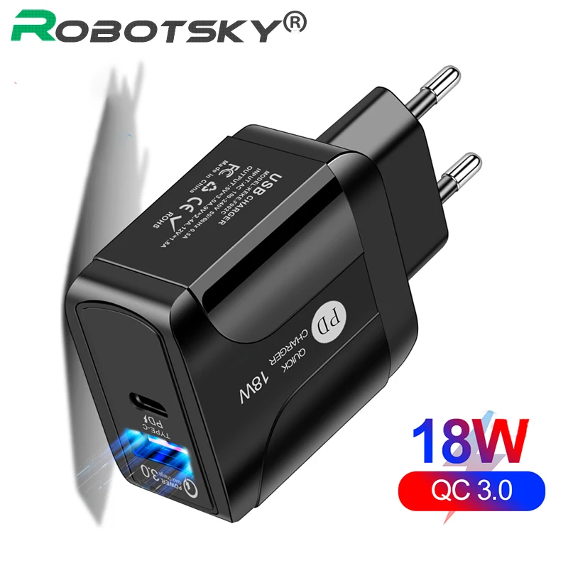 Адаптер зарядного устройства Robotsky USB Type C стандарта СШАЕСВеликобритании, 18 Вт, быстрая зарядка QC3.0 PD, зарядное устройство с вилкой для Samsung, Xiaomi, Huawei
