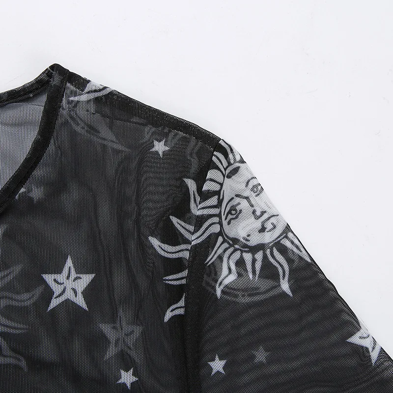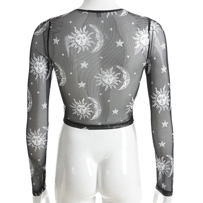 Сетчатые Топы в стиле Харадзюку, Просвечивающая футболка с длинным рукавом, модная женская сексуальная Прозрачная Футболка с принтом солнца, Луны и звезд, Женская Клубная одежда