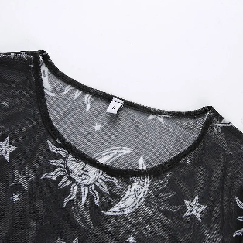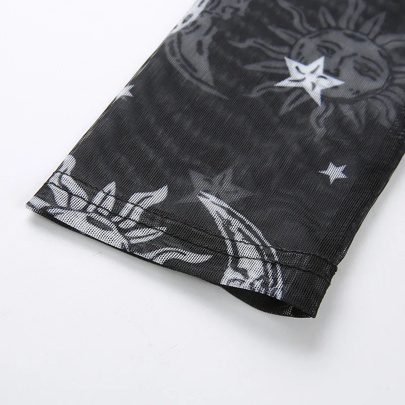 Harajuku сетчатые Топы с длинным рукавом Прозрачная Футболка модная женская сексуальная прозрачная Футболка с принтом Sun Moon Star Женская Клубная одежда